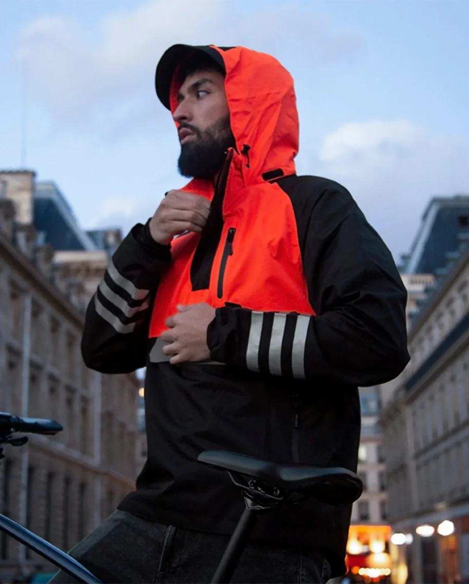Imperméable et déperlant, équipé d’une capuche à visière ergonomique, il vous garde au sec et vous permet de continuer de pédaler même sous la pluie.