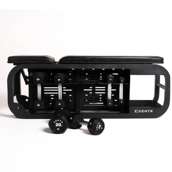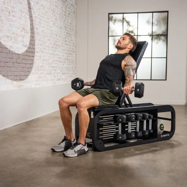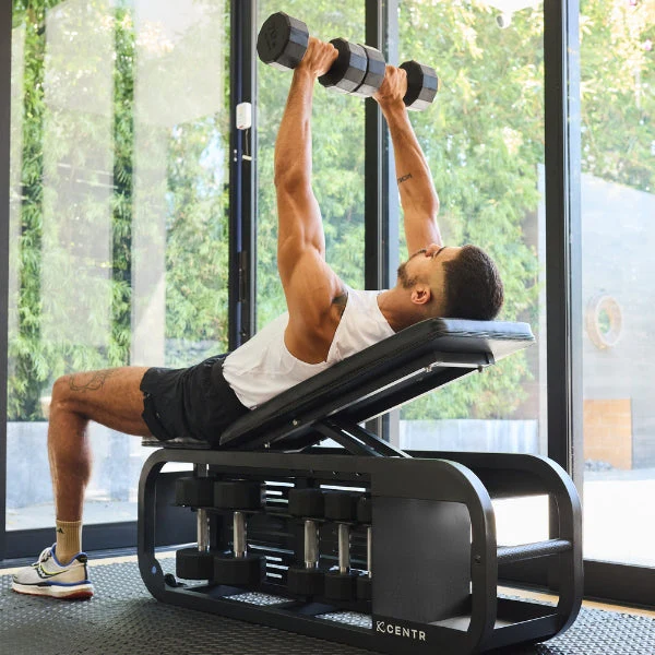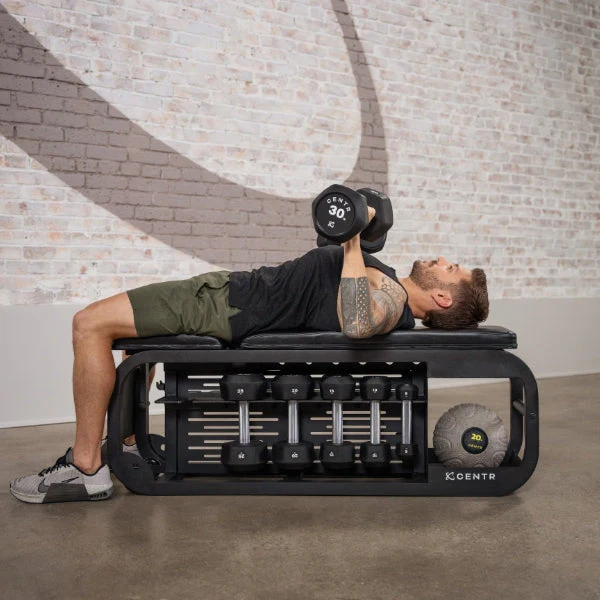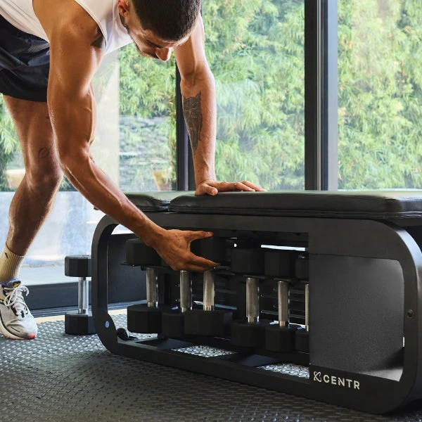 Le banc Centr Fusion est une solution tout-en-un pour des entraînements variés et un rangement élégant des haltères dans votre salle de sport à domicile. Développé couché, tirage, curls et bien plus encore en toute simplicité — tout en gardant vos poids à portée de main.