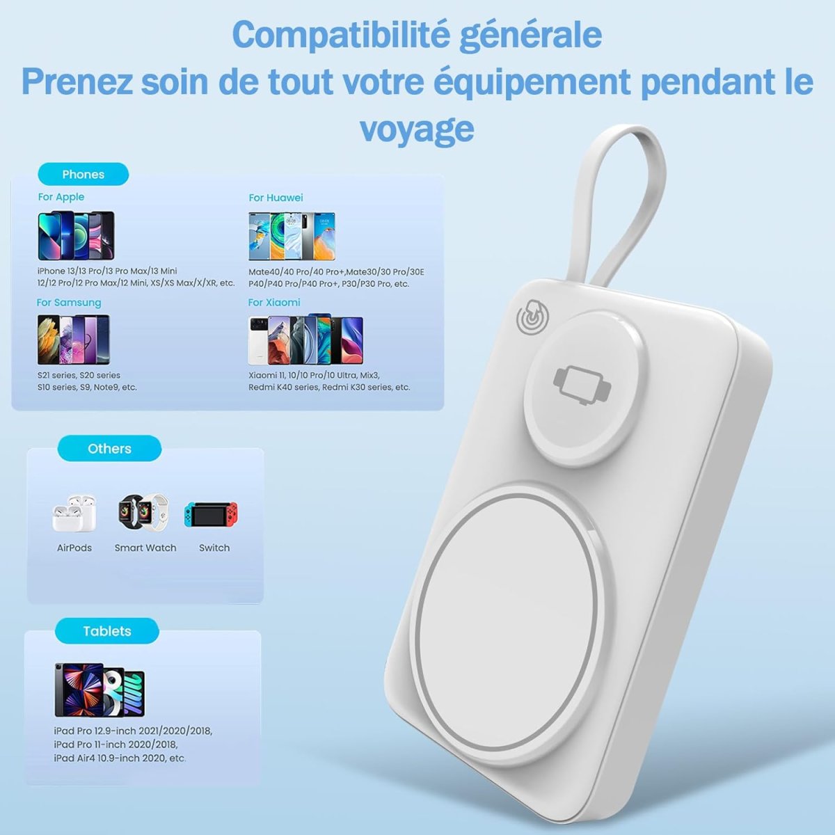 | Appareils compatibles : Smartphones, iPhone 16 à 12, Apple Watch 8/7, AirPods et écouteurs sans fil | |