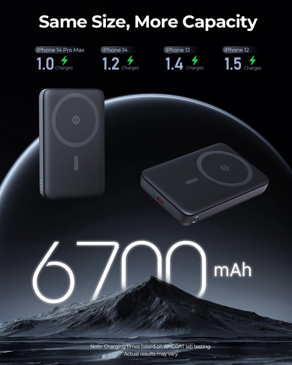 Malgré son design compact, notre power bank offre une capacité accrue de 6700mAh, complétée par une élégante coque de batterie de 5000mAh, ce qui vous donne 23 heures supplémentaires de lecture vidéo. Cela vous permet de rester connecté et de profiter de vos appareils plus longtemps sans vous soucier de la batterie.