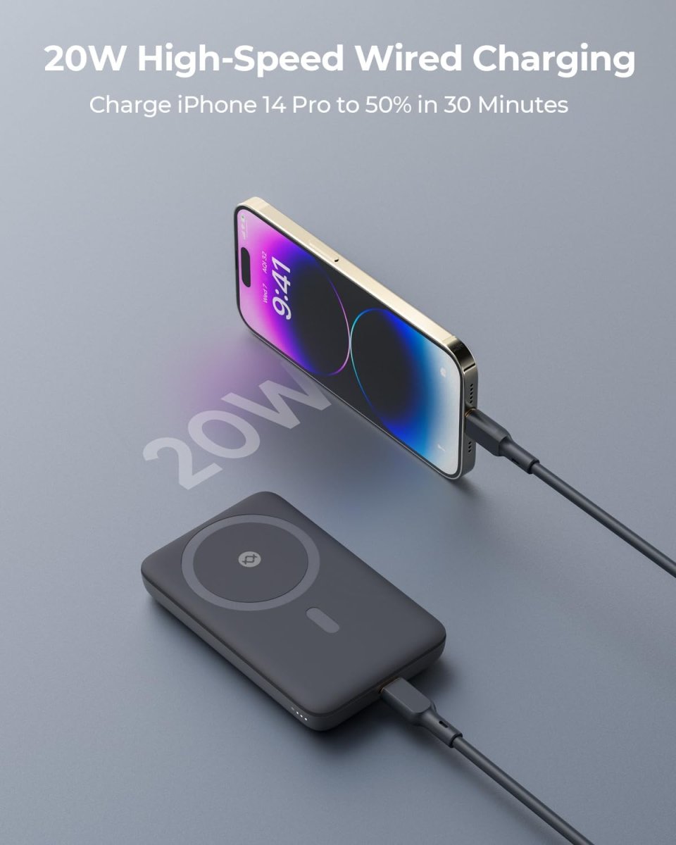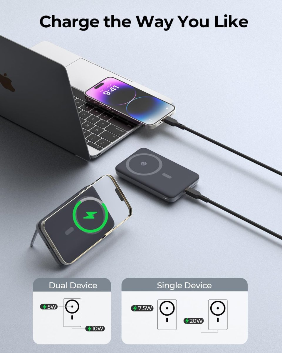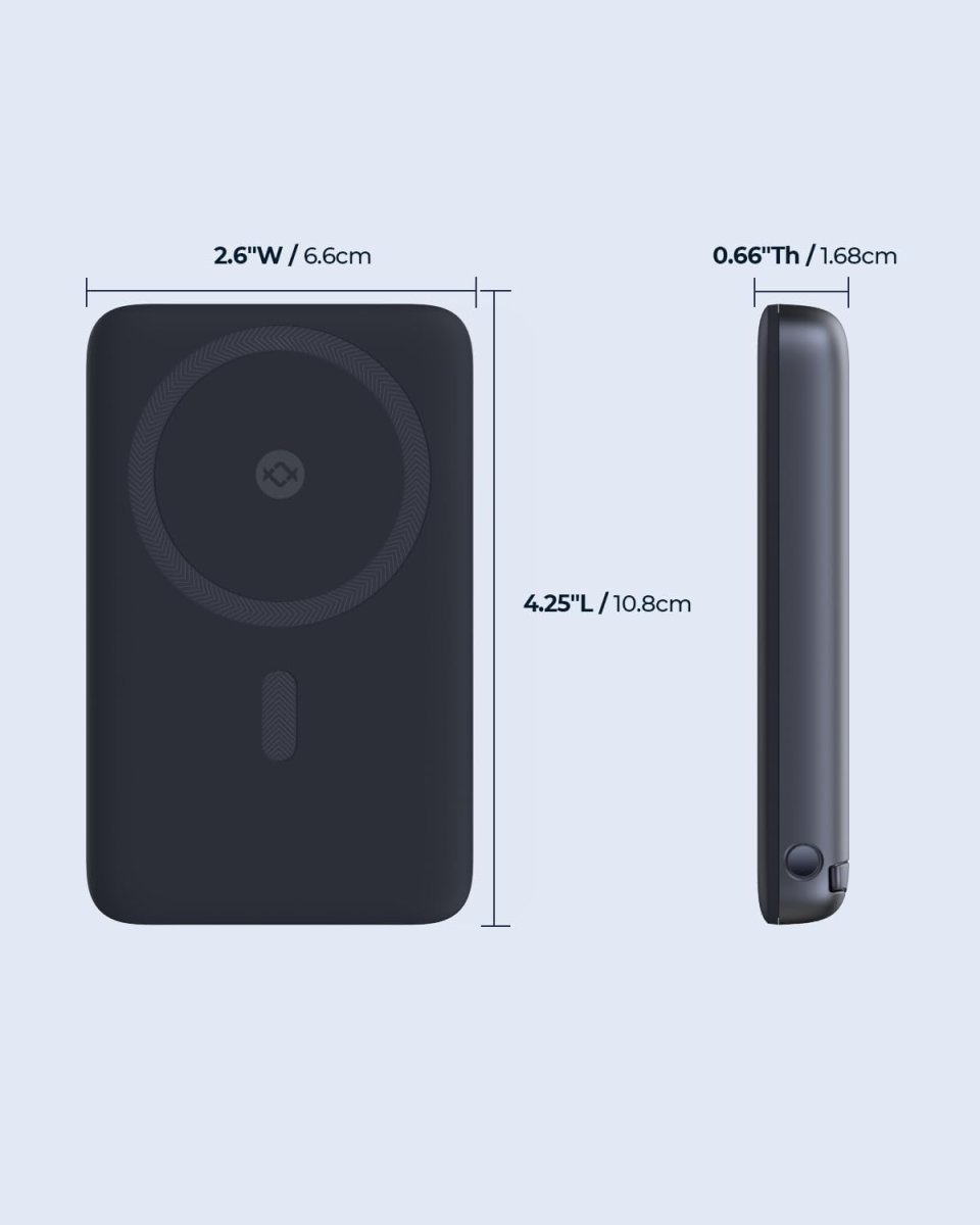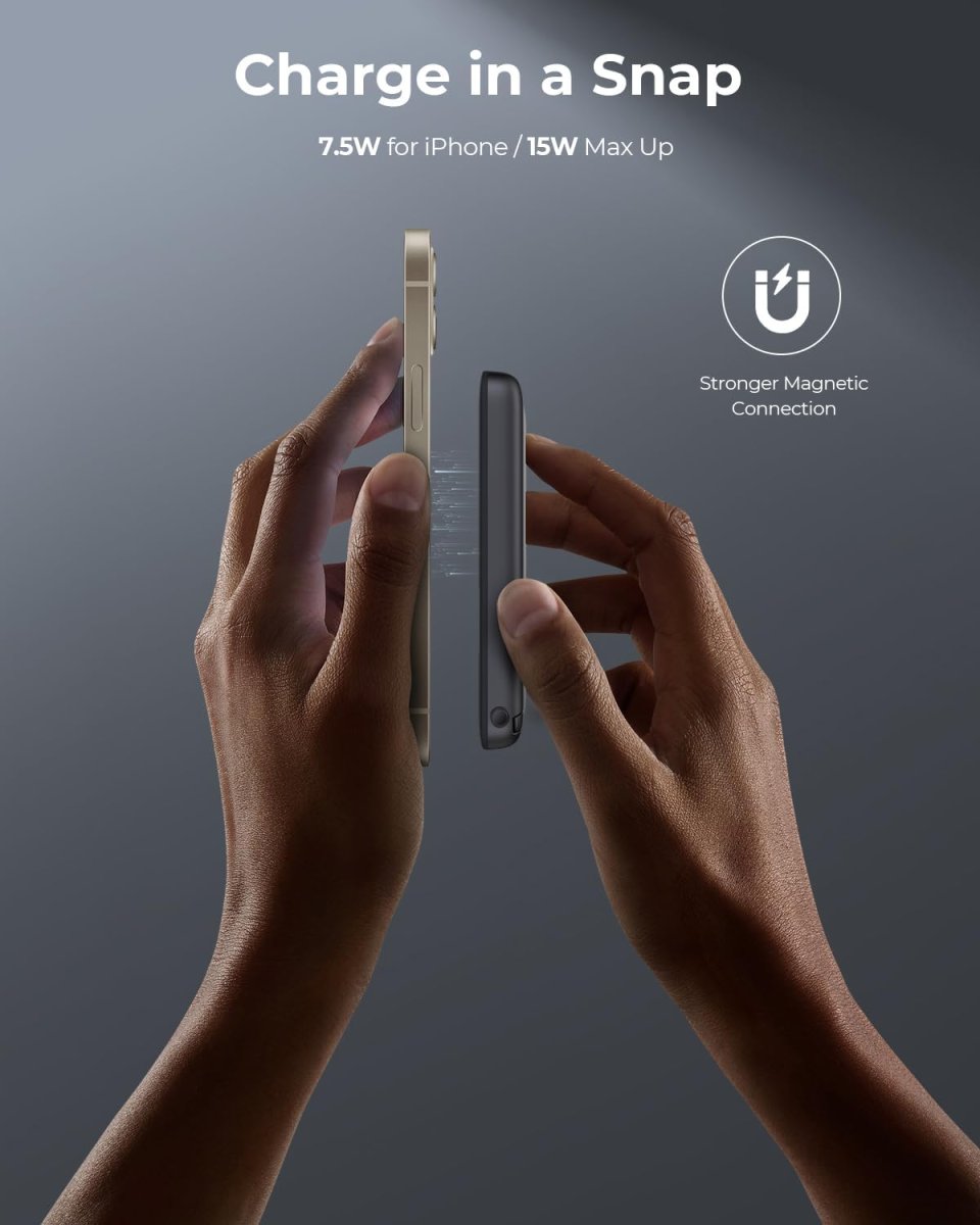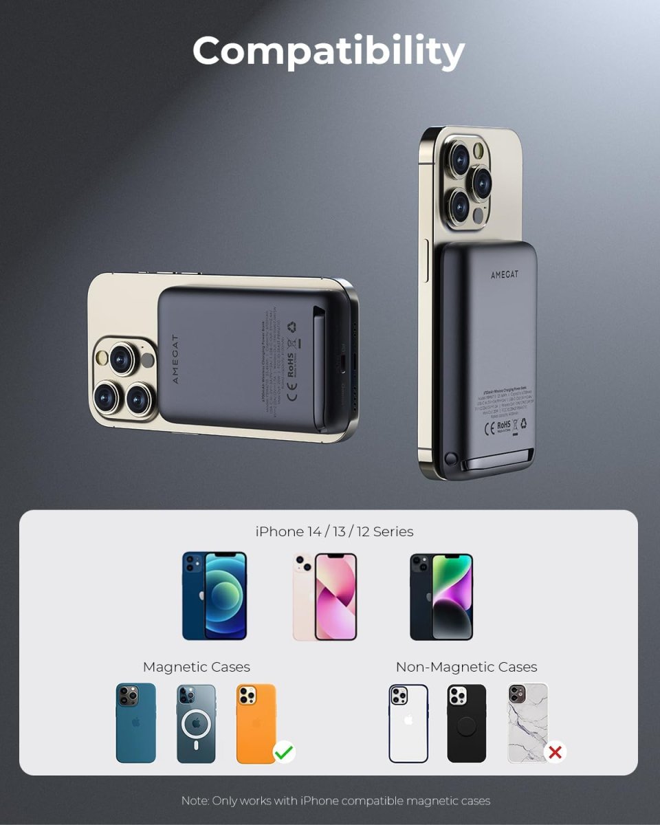 Notre Batterie Externe Avec Chargement À Induction offre une solution pratique et sans tracas pour alimenter votre appareil. Il suffit de fixer votre téléphone à la batterie externe et il se charge automatiquement sans que vous ayez besoin d’appuyer sur aucun bouton. Notre technologie de fixation magnétique assure une connexion sûre et fiable pour une recharge sans fil optimale. Nous recommandons d’utiliser un étui de téléphone magnétique ou de charger sans étui pour des performances optimales 🔥.