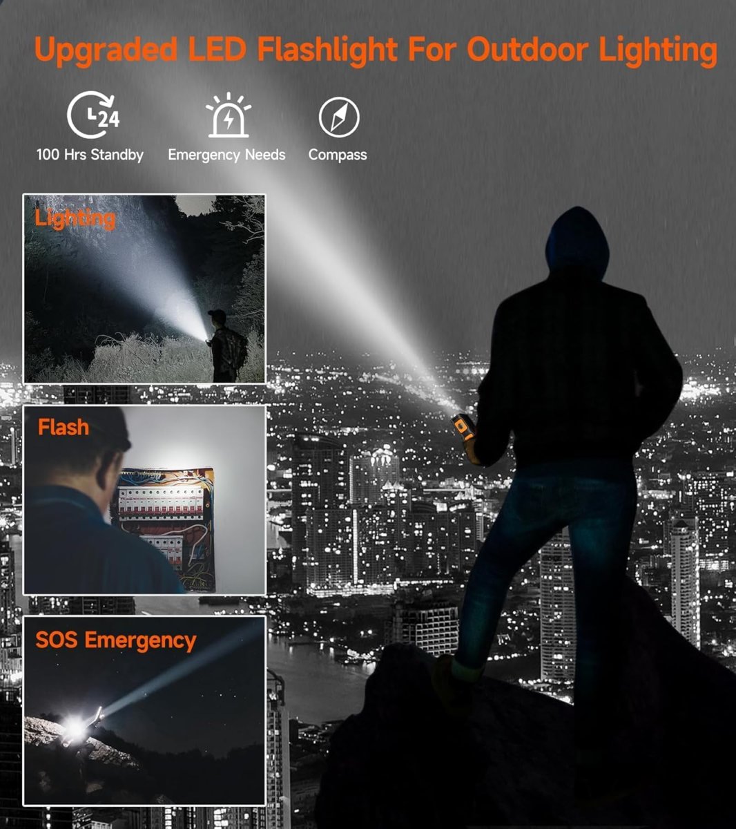 Deux lampes LED haute intensité sont intégrées pour offrir un éclairage fiable lors des activités nocturnes. Trois modes sont disponibles (puissant, SOS, stroboscopique), idéaux pour le camping, les urgences ou les randonnées nocturnes. Cette fonctionnalité lumineuse intégrée renforce le caractère utilitaire de la batterie et en fait un outil indispensable pour les séjours en pleine nature ou les situations imprévues.