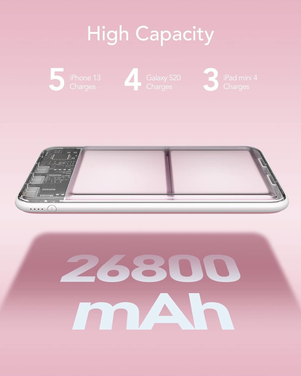La batterie externe offre une puissance de 26800mAh, capable de charger un iPhone X/8 jusqu’à six fois et demie, ou un iPad Mini deux fois avec une seule charge complète. -