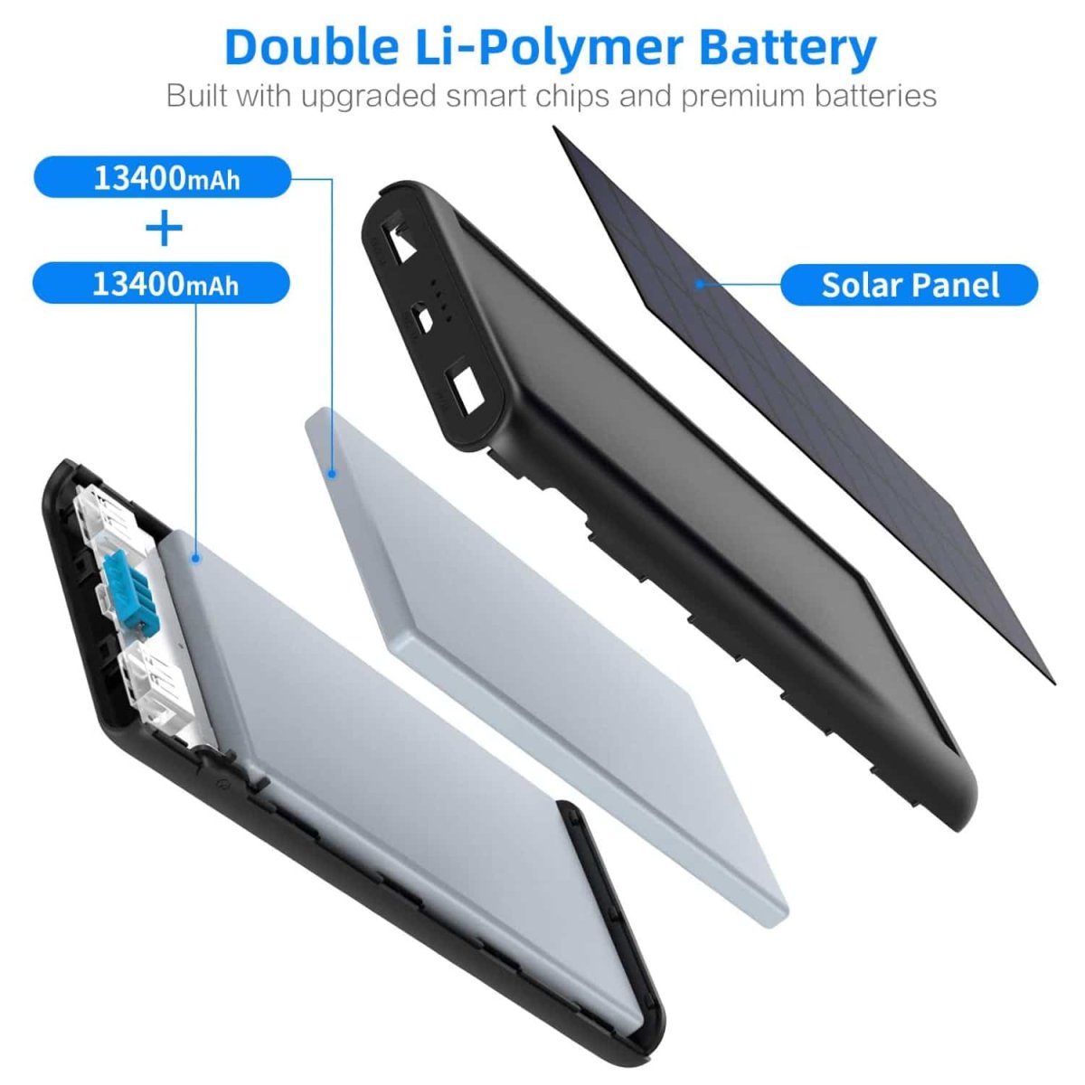 Une batterie externe peut se trouver très utile lors d’excursions comme du camping ou de la randonnée. Découvre dès maintenant l’une de nos batteries externes la plus adaptée à ce genre de situation . Son énorme capacité de 26 800 mAh lui permet de recharger 6-7 fois un smartphone en moyenne avant de se vider. Un panneau solaire est intégré afin d’avoir toujours un minimum de batterie tant qu’il y a du soleil
