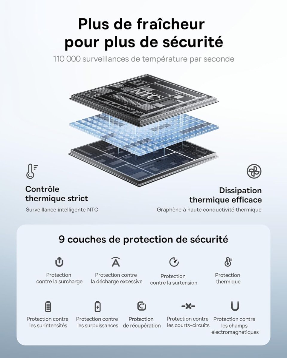 En conclusion, notre batterie externe allie puissance, autonomie et sécurité dans un format pensé pour la mobilité, offrant une solution fiable et performante à tous vos besoins énergétiques.