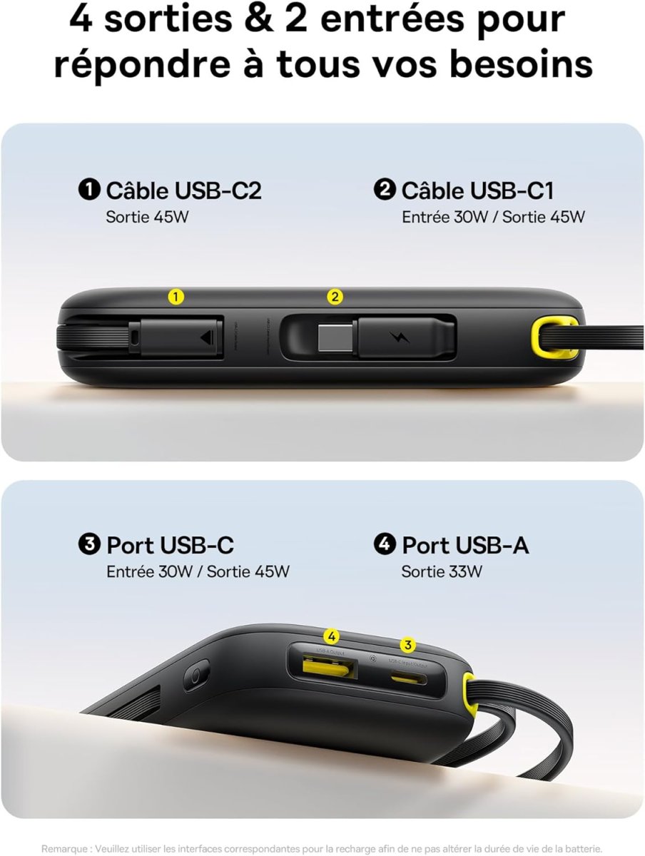 La puissance de sortie atteint jusqu’à 45W, ce qui permet d’alimenter rapidement vos équipements. Notre batterie prend en charge différents protocoles de charge afin de s’adapter aux besoins spécifiques de chaque appareil. La présence d’un câble intégré rend l’utilisation plus fluide et réduit la nécessité d’accessoires supplémentaires. Vous bénéficiez d’une recharge optimisée en continu, même lors d’une utilisation intensive. Grâce à cette innovation technologique, vos appareils regagnent de l’énergie en un temps réduit.