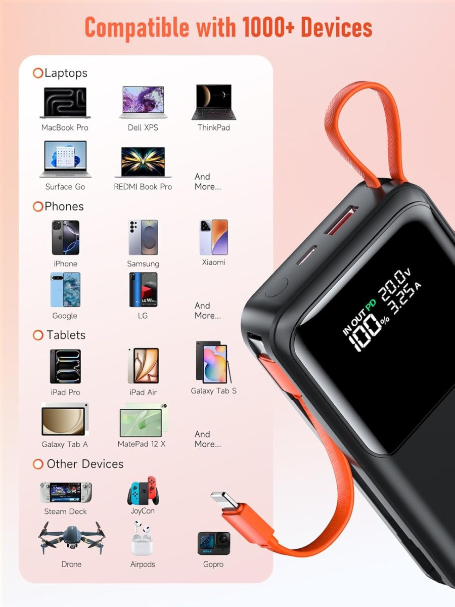 Notre chargeur portable universel prend en charge tous les appareils USB, y compris les téléphones, tablettes, ordinateurs portables et petits accessoires comme les écouteurs, montres et trackers de fitness. Cette polyvalence garantit une compatibilité maximale, une flexibilité d’usage, et une simplicité d’intégration pour tous vos gadgets numériques.