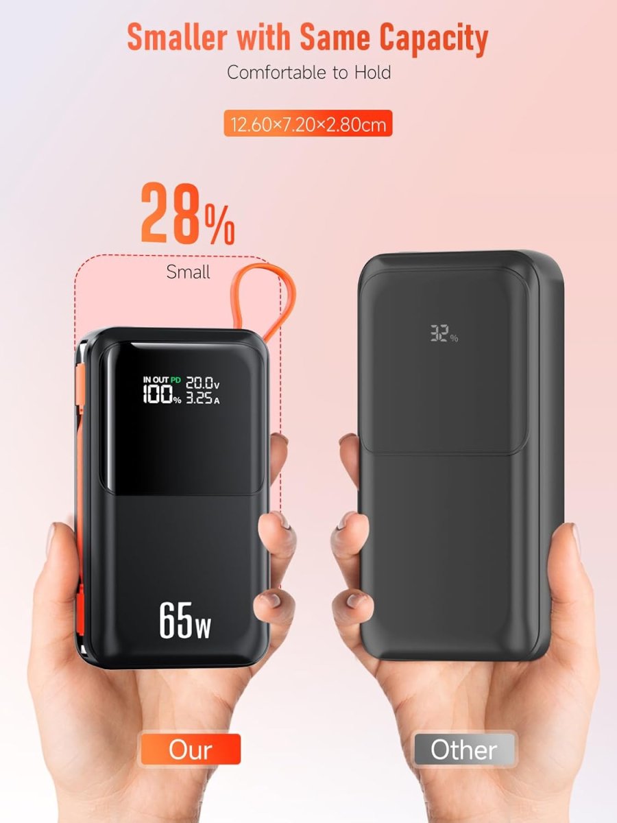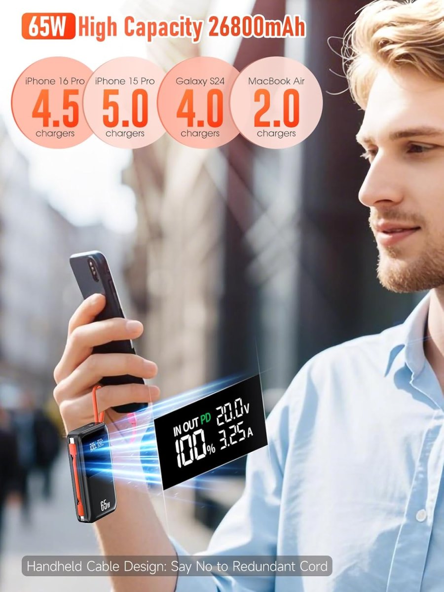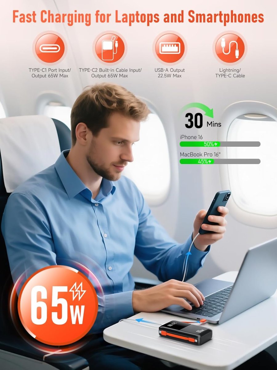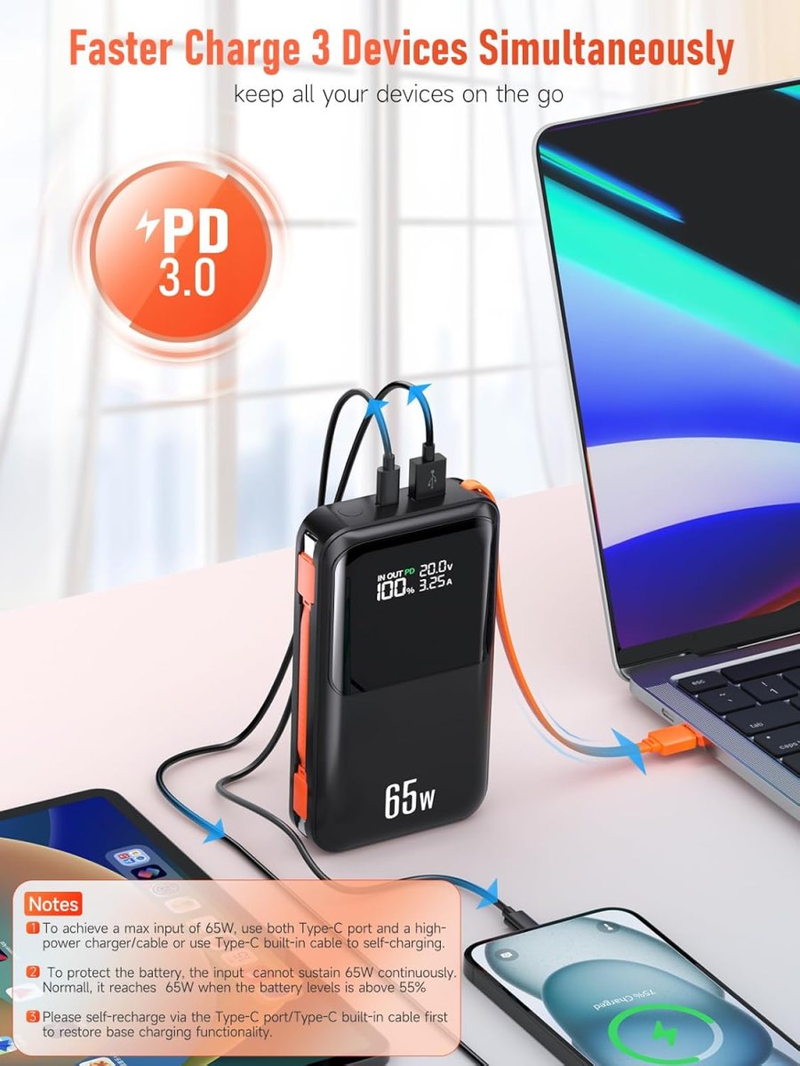 Notre batterie externe haute capacité intègre une puissance de charge de 65 W, permettant de recharger rapidement un ordinateur portable ou un smartphone. Cette performance assure une alimentation fiable, une vitesse de charge optimisée, et une gestion efficace de l’énergie pour vos appareils numériques. Grâce à ses ports USB-C, la batterie atteint 100 % de charge beaucoup plus rapidement que les modèles classiques.