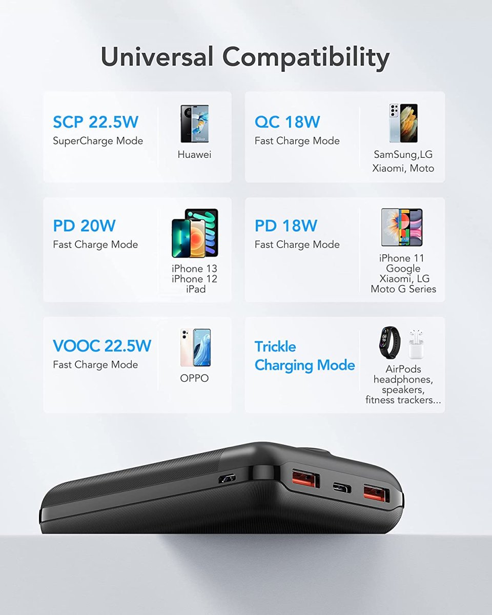 Notre Power Bank de la fameuse marque Veger a une grande capacité de 20000 mAh permettant de recharger environ 4 fois un téléphone portable. Munie de technologies avancées (PD/QC) et d’une puissance de 20W elle peut recharger 3 fois plus rapidement un smartphone qu’une charge classique ❤️.
