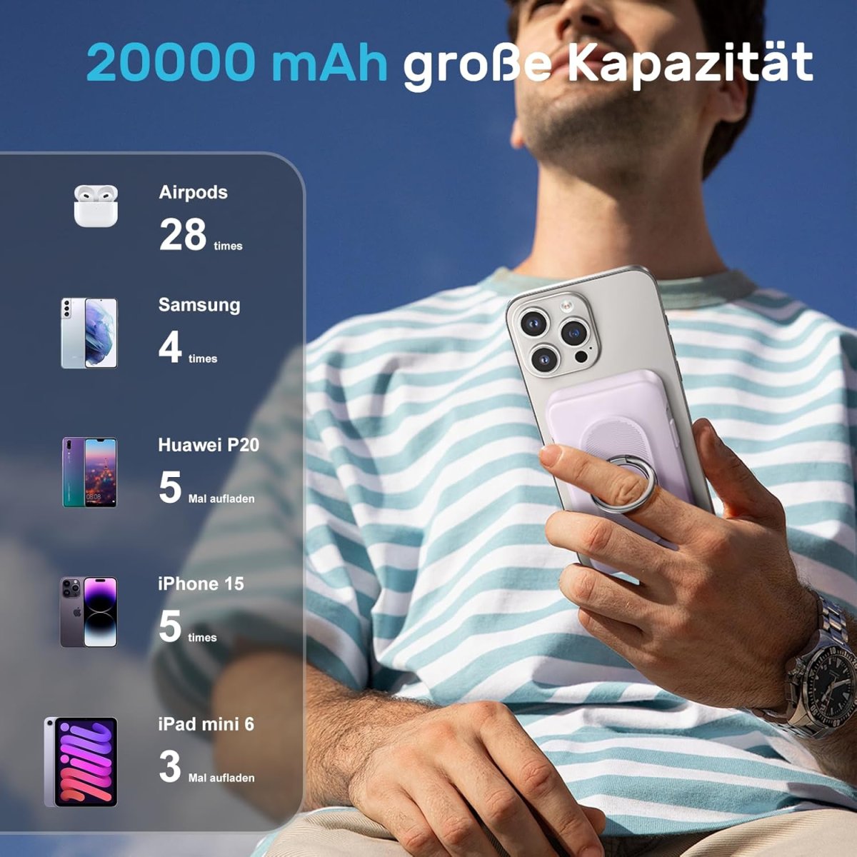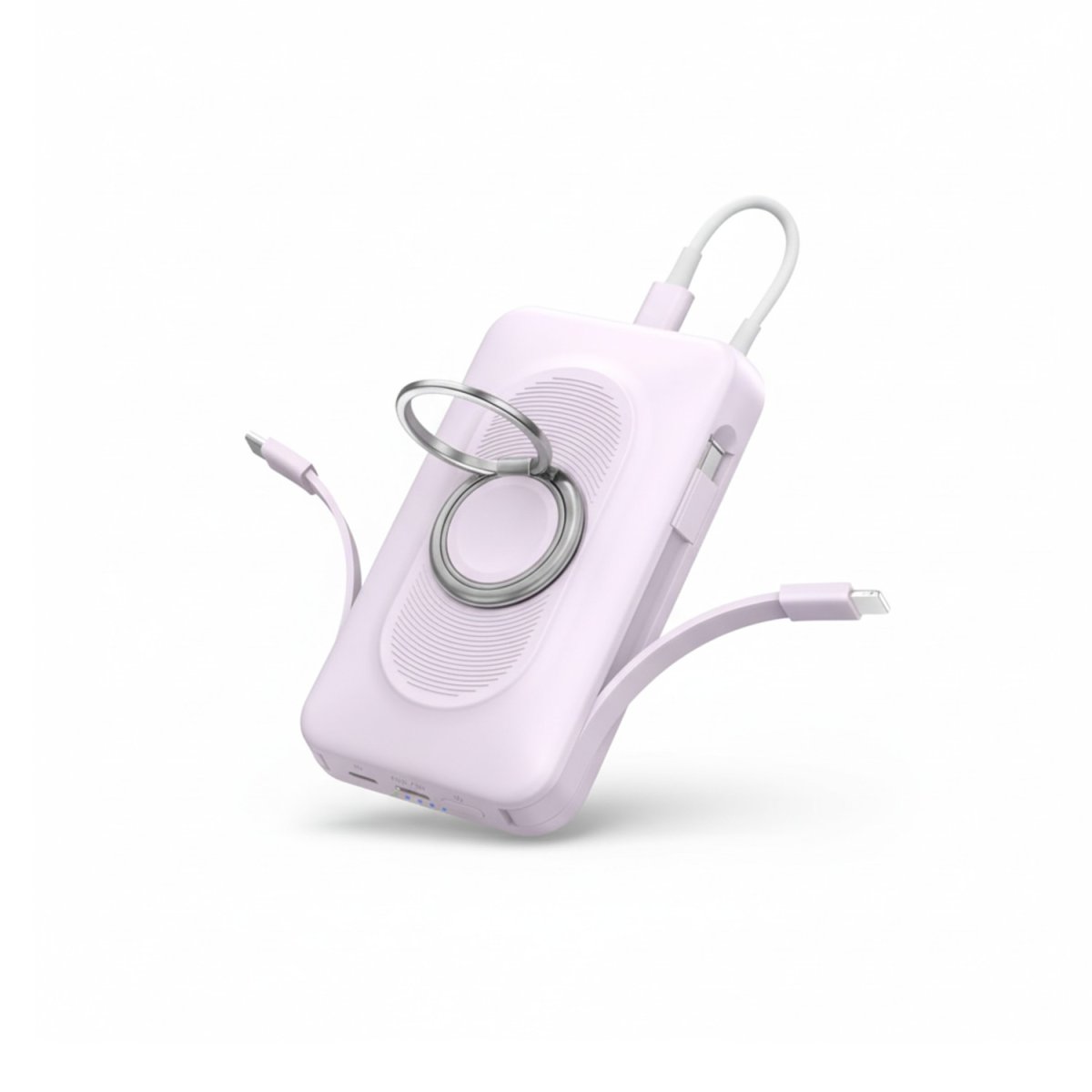 Équipée d’un anneau-support pratique, notre batterie portable multifonction peut être tenue facilement à la main ou utilisée comme support d’appareil. Ce dispositif permet de poser votre smartphone en position idéale pour un visionnage confortable de vos vidéos, appels visio ou activités multimédia. Une solution qui allie ergonomie, confort et praticité.