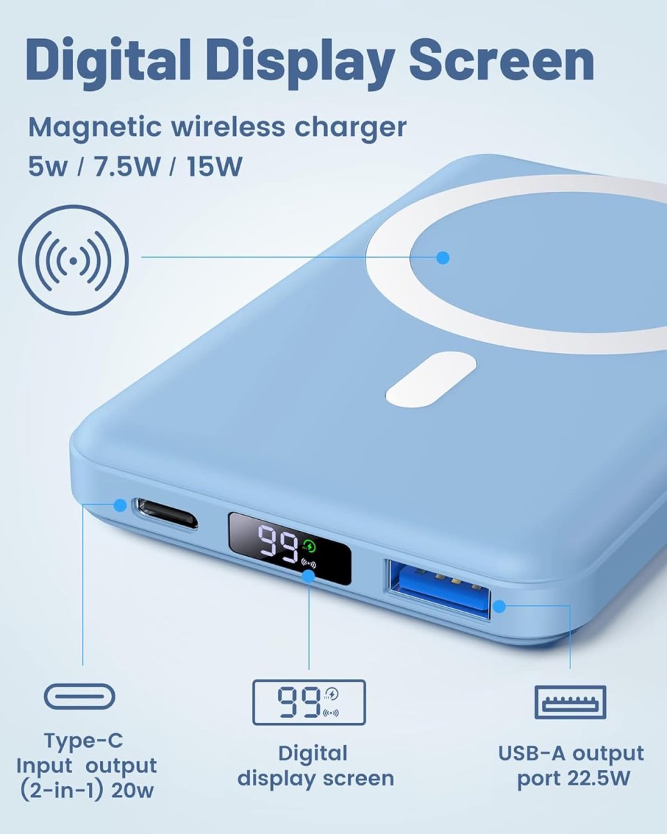 Équipée d’une sortie filaire haute puissance de 22,5W, notre batterie peut charger jusqu’à trois appareils simultanément : deux via câbles, un en sans fil rapide (jusqu’à 15W). L’écran LED numérique intégré vous informe en temps réel du niveau d’énergie restant, garantissant un contrôle constant de l’autonomie. Cette fonction rend la gestion de la charge à la fois intuitive et efficace.