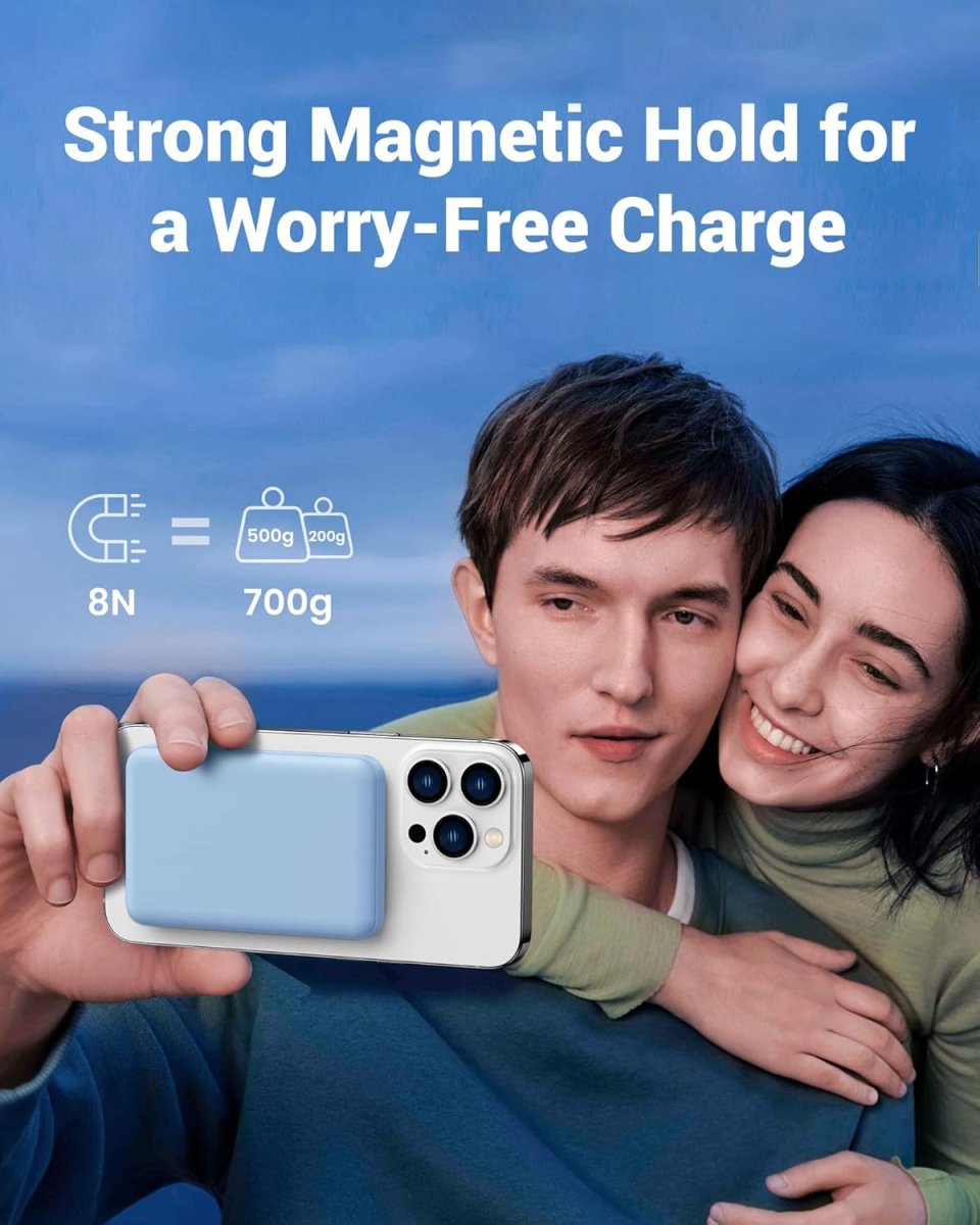 Dotée d’une technologie de charge magnétique avancée, notre batterie externe certifiée MagSafe offre une fixation solide et automatique à l’arrière de votre appareil. Elle est parfaitement adaptée aux modèles récents compatibles avec ce système, assurant une expérience de charge fluide. Sa surface antidérapante, ses aimants puissants, son fonctionnement sans fil et sa compatibilité étendue en font une solution pensée pour un usage mobile de haute qualité.