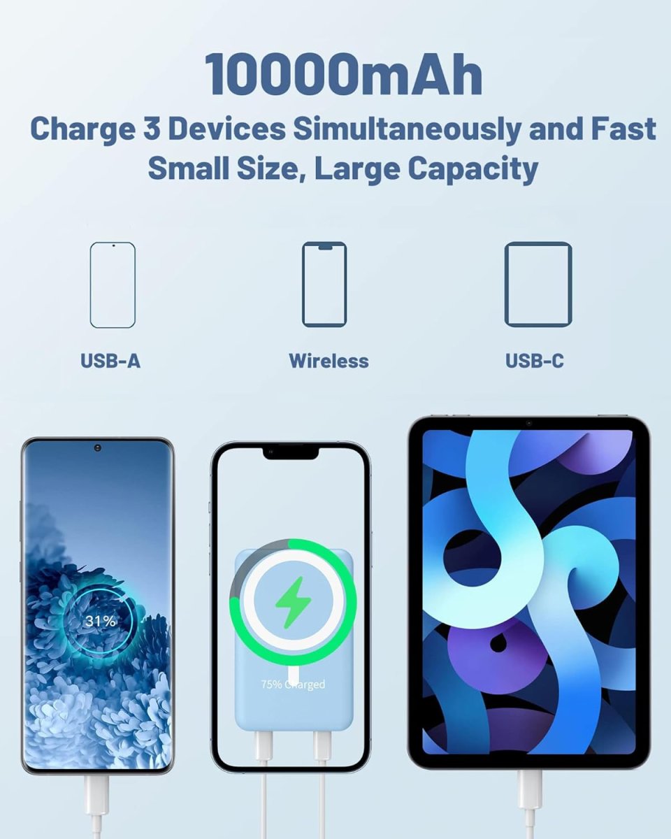 Avec ses 10000 mAh, notre solution de charge fournit une autonomie suffisante pour tenir une journée complète sans prise secteur. Grâce à un courant stable, à une alimentation continue, et à un design optimisé, elle permet de recharger efficacement vos appareils où que vous soyez. L’intégration magnétique facilite la mise en place et limite les risques de déconnexion, même en déplacement.