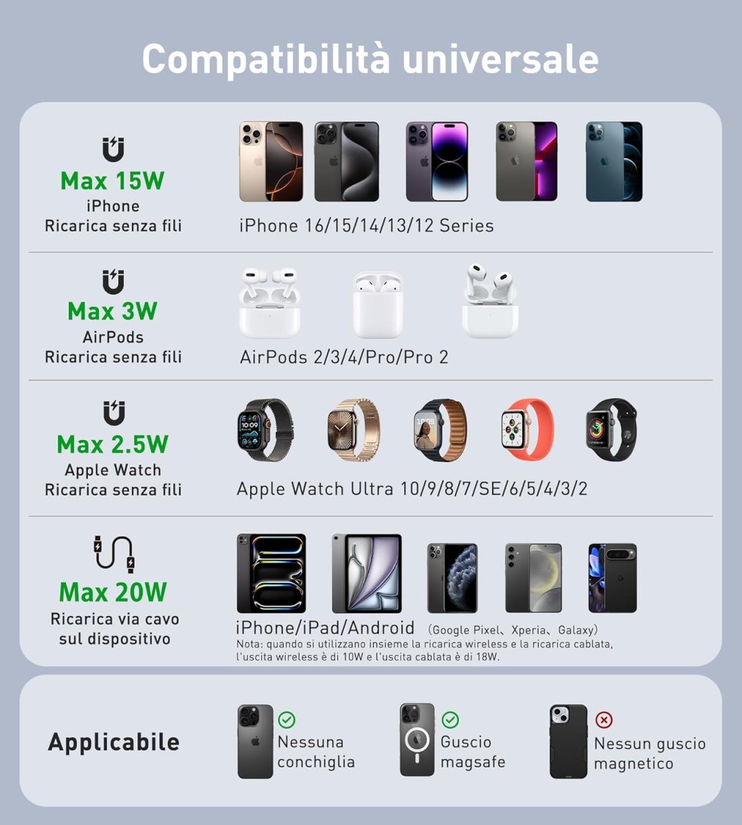 | Puissance maximale : 20W filaire / 15W sans fil smartphone | |