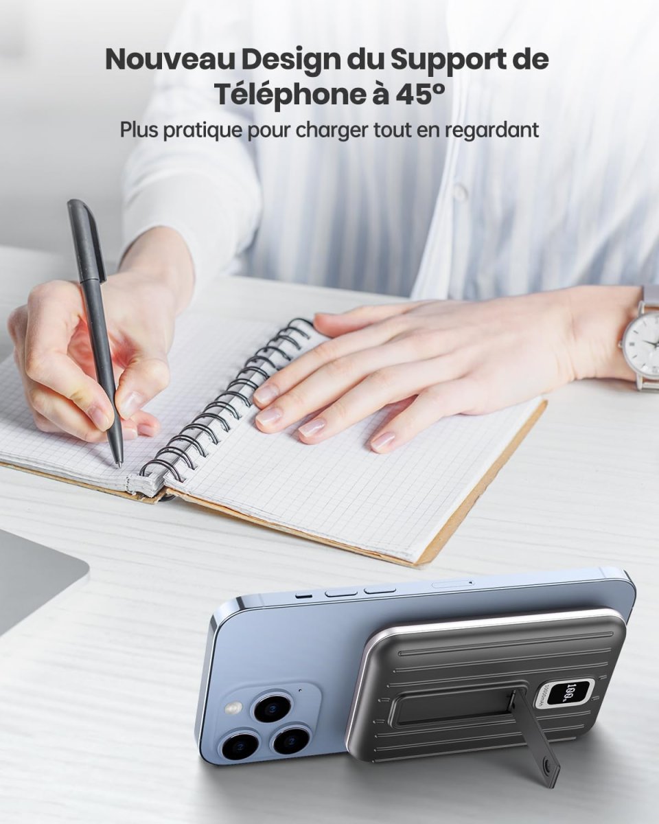 La batterie externe rapide prend en charge la charge sans fil jusqu’à 15 W et les ports USB-C/USB-A jusqu’à 22,5 W. Notre technologie assure une recharge complète, une stabilité parfaite et une vitesse maximale pour smartphones, tablettes et accessoires, offrant ainsi un confort optimal lors de l’utilisation quotidienne.
