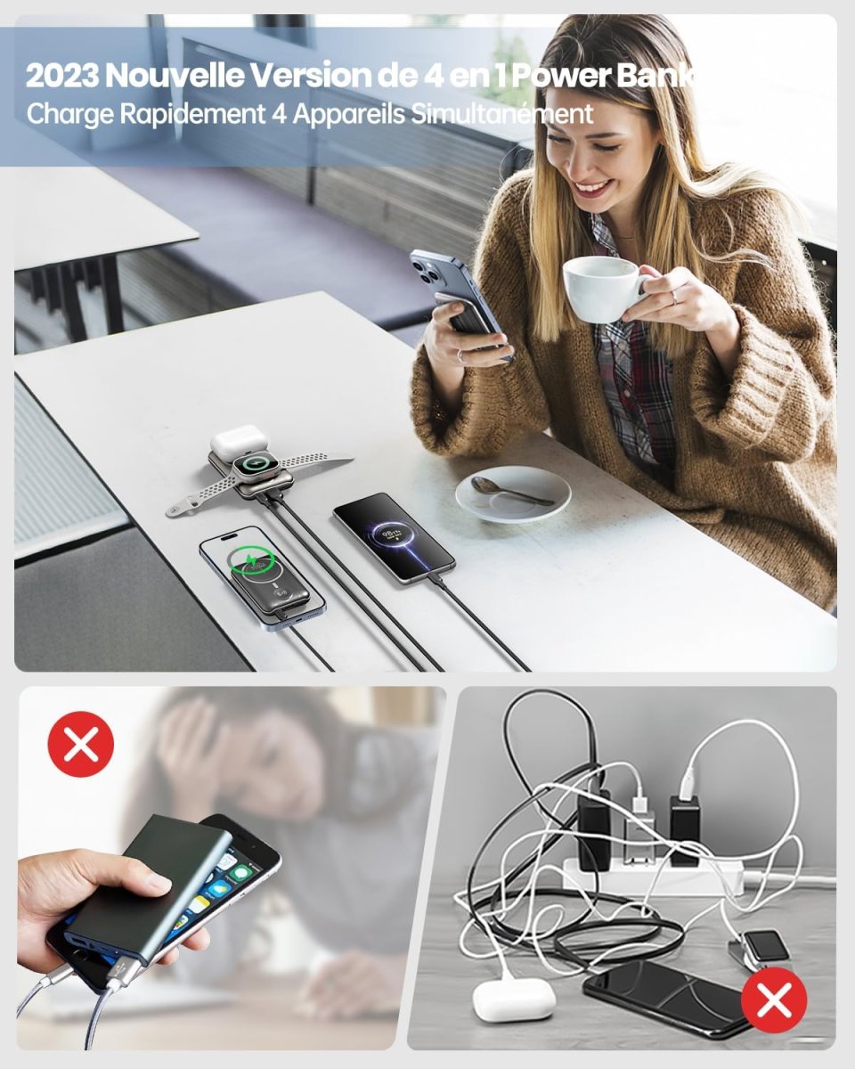Notre power bank multiple permet de recharger jusqu’à 3 appareils en même temps, combinant ports magnétiques et câbles USB. Elle offre un fonctionnement fluide, une compatibilité étendue et une praticité idéale pour vos iWatch, AirPods et ordinateurs portables lors de vos déplacements.