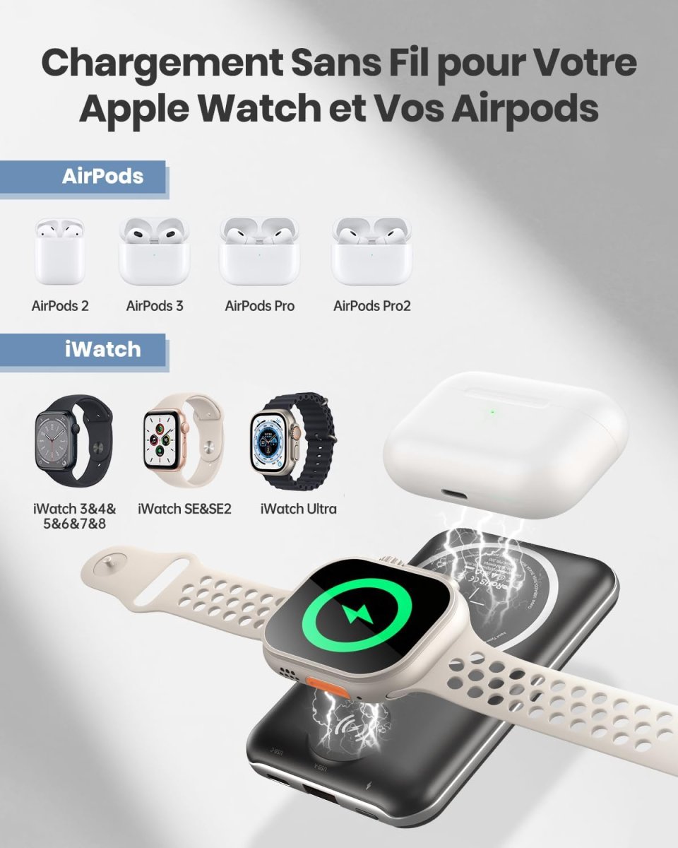 Notre batterie externe combine puissance, praticité et sécurité pour répondre à tous vos besoins de recharge mobile. Conçue pour les iPhone, iWatch, AirPods et appareils USB, elle permet une charge rapide et simultanée, même en déplacement. Son format compact et léger assure un transport facile et une utilisation confortable lors de vos voyages ou activités quotidiennes.