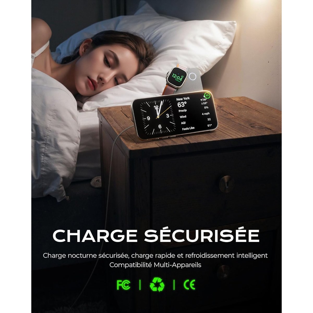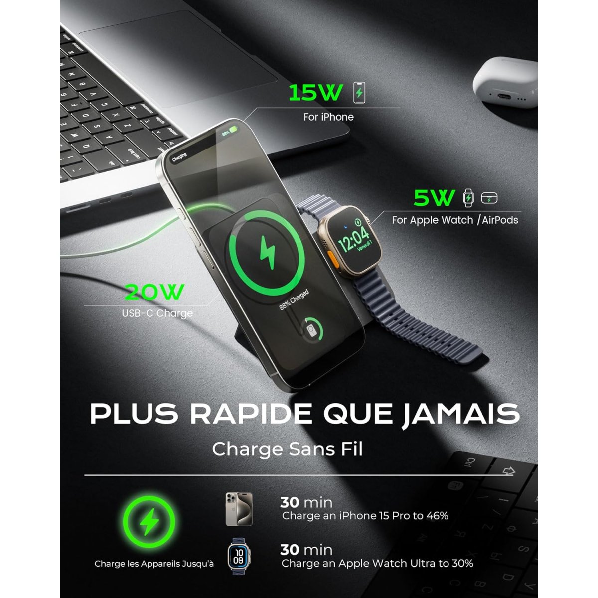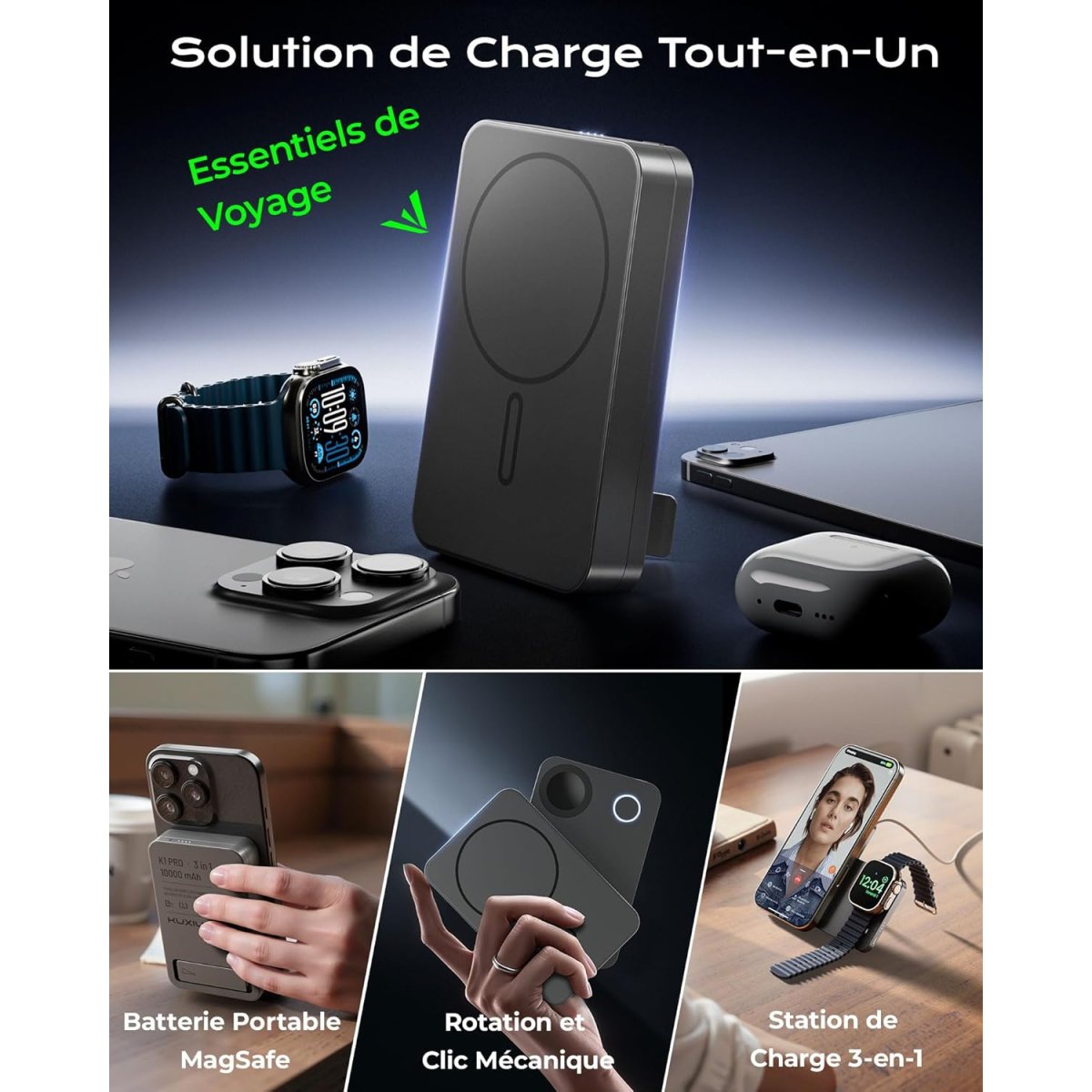 | Appareils compatibles : iPhone 12 à 16 (avec étui MagSafe), Apple Watch (séries 4 à Ultra 2), AirPods (2/3/4/Pro) | |