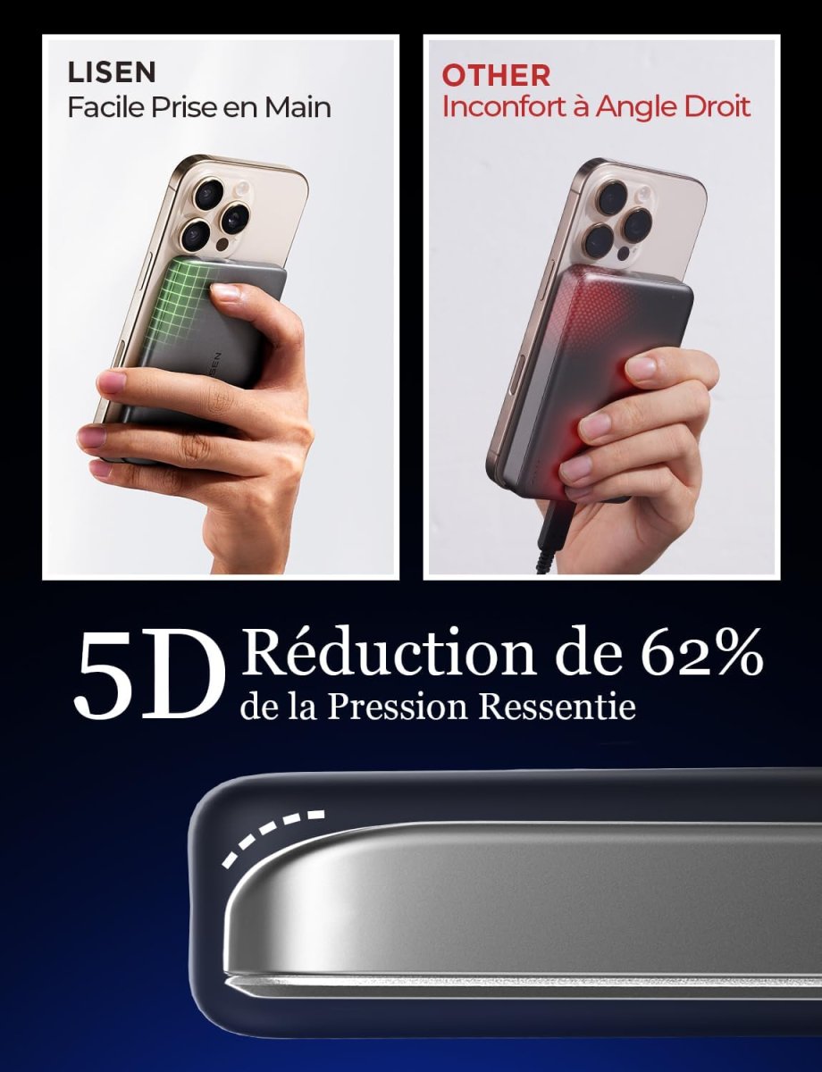 Notre solution énergétique ultra mince affiche seulement 0,8 cm d’épaisseur, ce qui en fait un accessoire pratique et facile à transporter. Sa fixation magnétique assure un maintien sécurisé pendant la charge, garantissant une utilisation fluide. Grâce à sa conception compacte, cette batterie portative fine combine légèreté, confort et efficacité au quotidien.