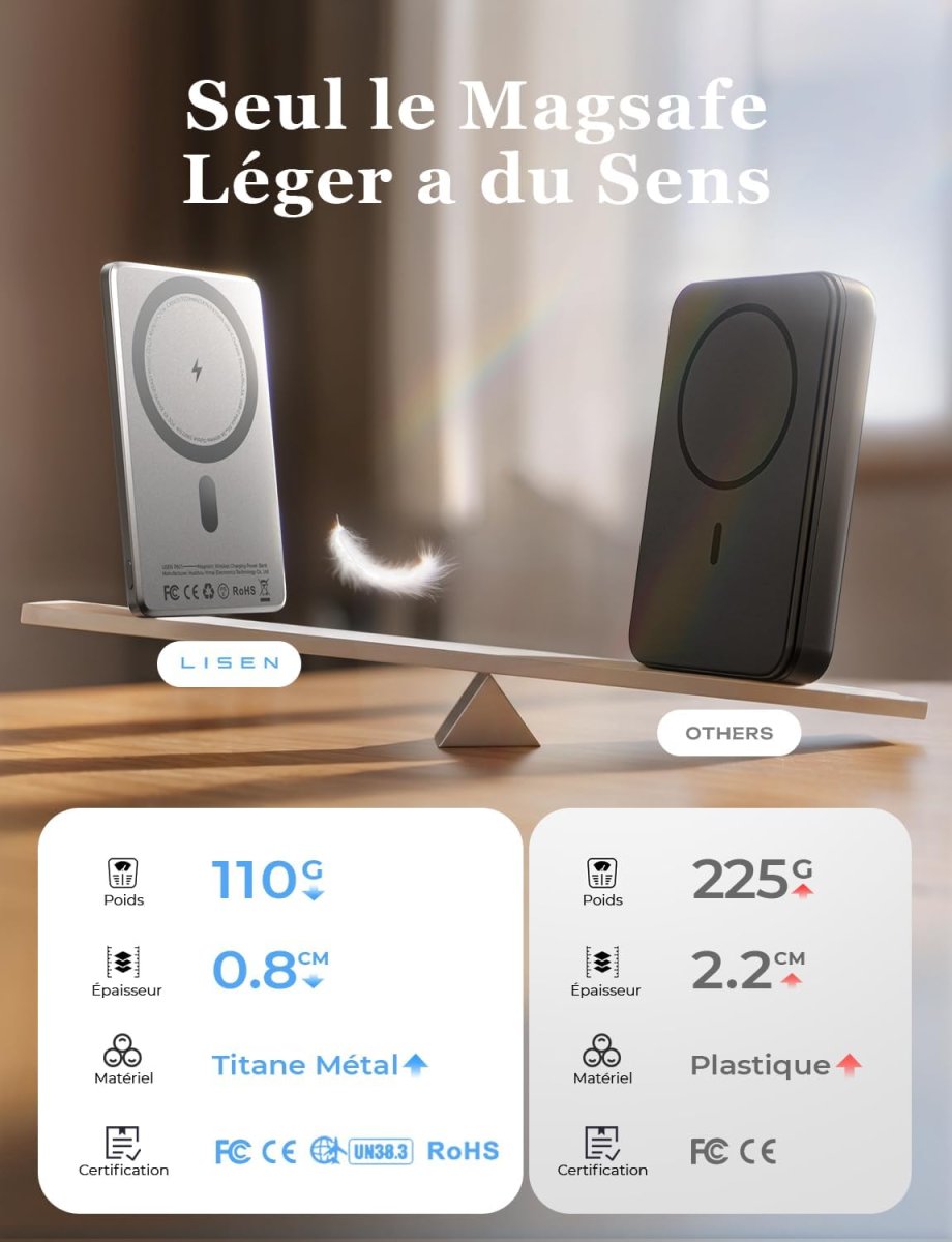 En conclusion, notre batterie magnétique ultra fine combine design moderne, performance fiable et praticité. Elle répond parfaitement aux besoins d’énergie mobile tout en offrant une expérience agréable et durable.