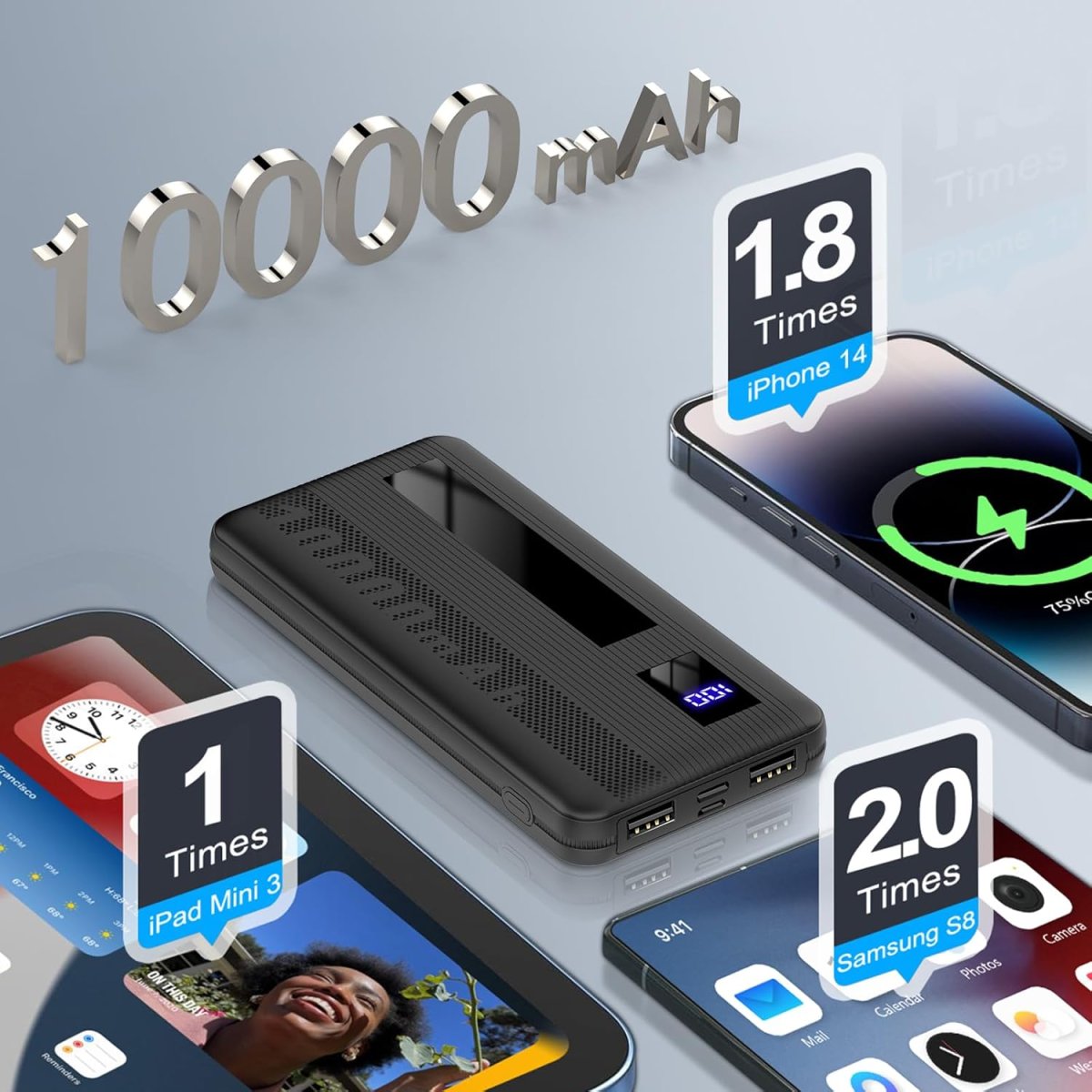 Avec sa batterie haute densité de 10000mAh, cette batterie externe offre jusqu’à 50 heures de charge supplémentaire pour un iPad Air, recharge un iPhone 13 jusqu’à 3 fois et un Samsung Galaxy S22 jusqu’à 2 fois. Elle est idéale pour les déplacements ou les situations sans prise de courant. Ne laissez plus jamais la batterie faible interrompre votre journée!