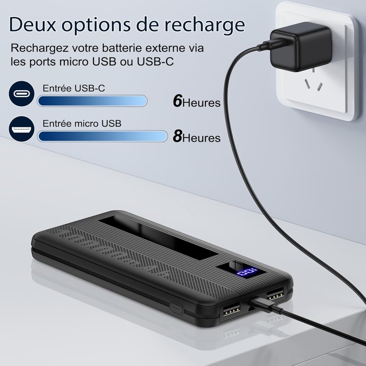 Alimentez simultanément jusqu’à 2 appareils grâce à ses deux sorties USB Smart Identification qui adaptent automatiquement le courant pour une recharge rapide et optimale. Avec ses 2 entrées (USB-C et Micro USB), rechargez la batterie selon vos préférences et optimisez votre temps.