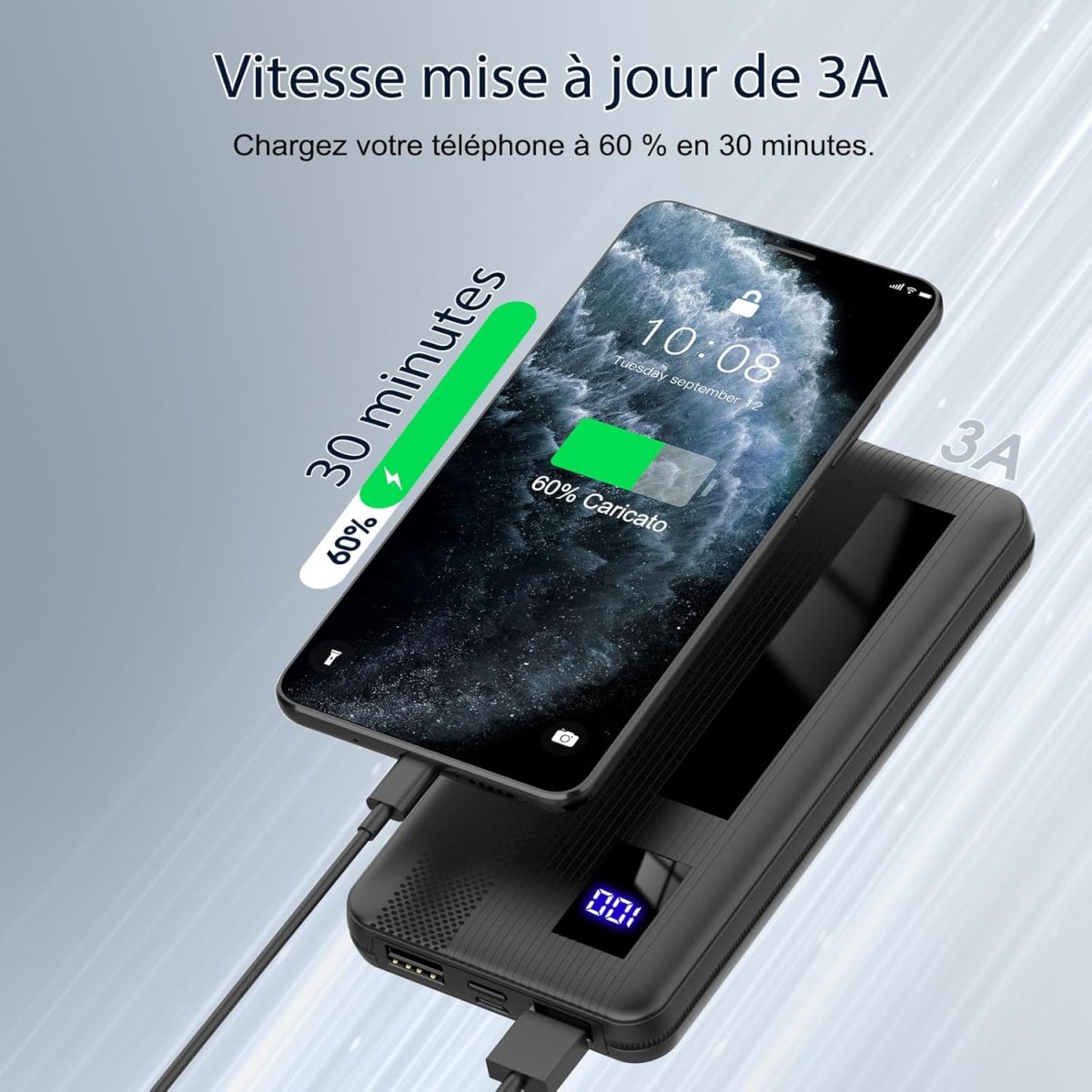 - Recharge 2-3 fois le téléphone – 10000 mAh