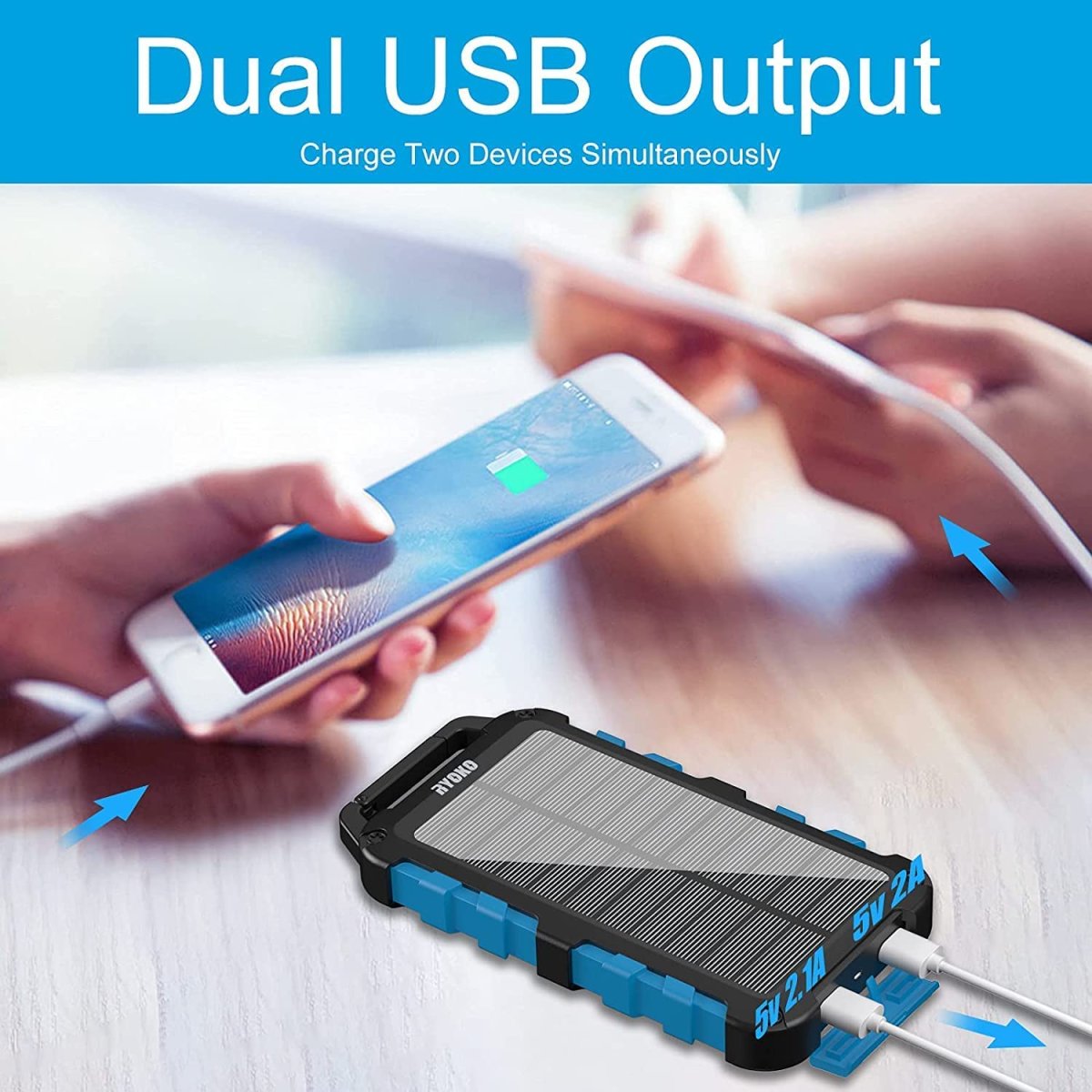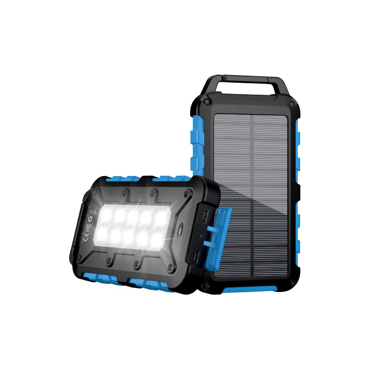 Avec 2 ports de sortie USB (2A / 2.1 A) et un port USB-C pour une charge rapide (3A), cette batterie vous permet de charger deux appareils simultanément. La recharge via panneau solaire est disponible en cas d’urgence, pour une solution de secours efficace.