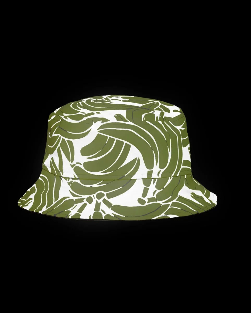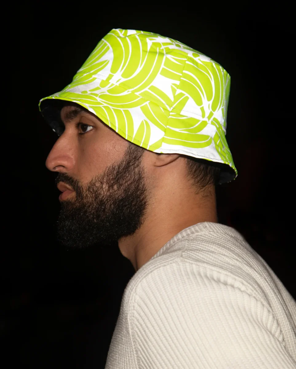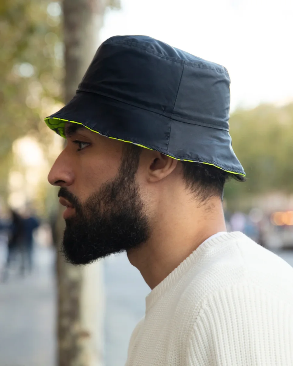 Ce bob est aussi upcyclé. Nous avons décidé de revaloriser les matières et donc d’utiliser le tissu de la veste banana afin de ne pas avoir de stock dormant. Ce bob est également confectionné en France dans un centre d’insertion.
