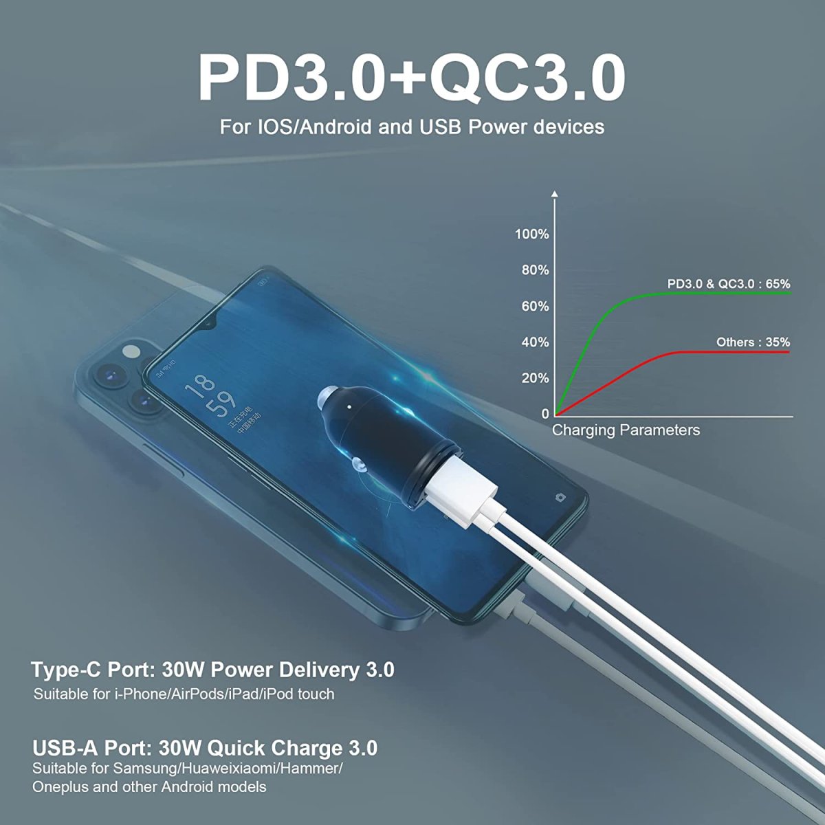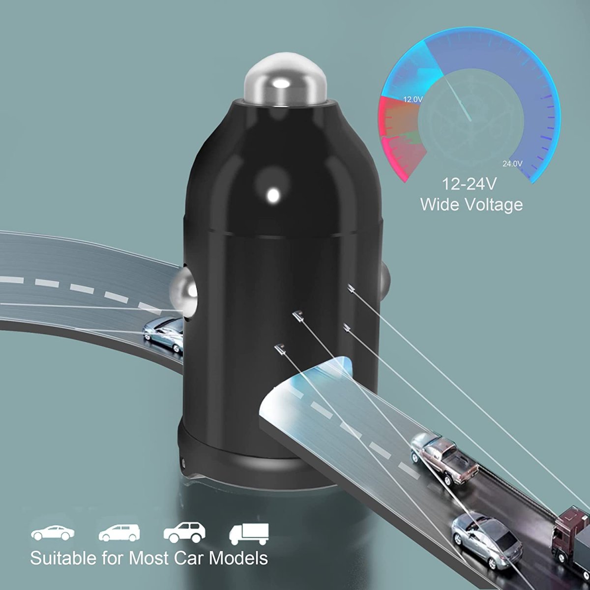 Notre Chargeur de smartphone pour voiture a une tension régulable de 12 à 24 Volts (12/24V) et une puissance de 30 watts au total rechargeant ainsi les GSM rapidement (iPhone 13 de 0% à 50% en env. 30 minutes) ❤️.