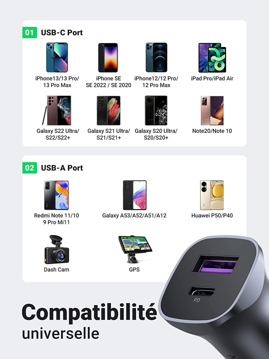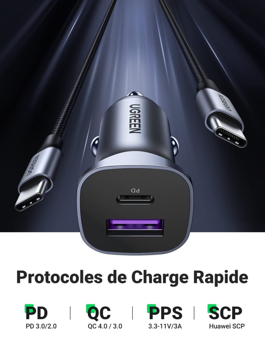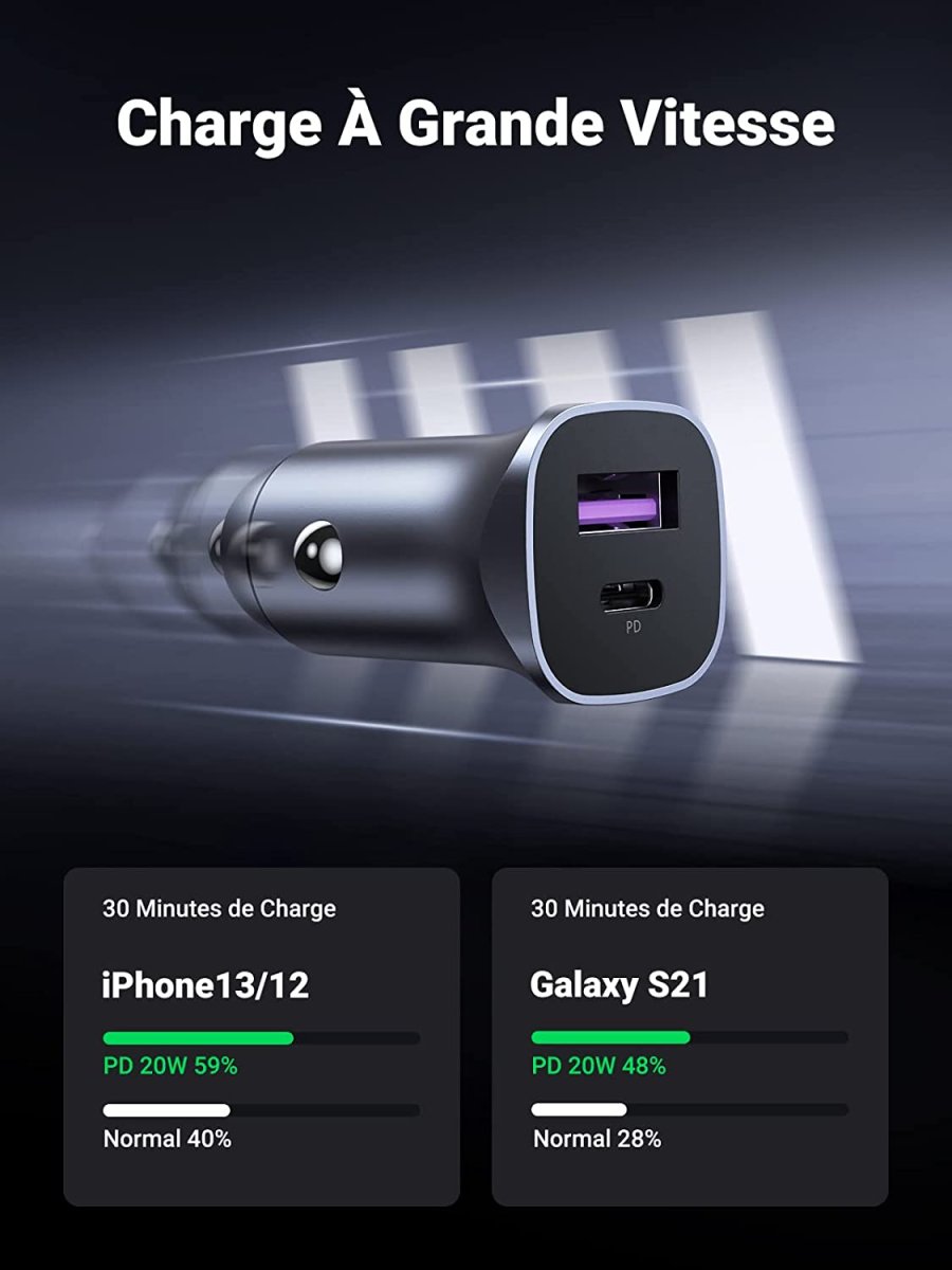 Notre Chargeur de voiture Ugreen spécialement conçu pour voiture s’insère dans l’embout Allume Cigare de cette dernière. Son port USB-A et son port USB-C dispose chacun d’une vitesse de recharge très rapide ❤️.