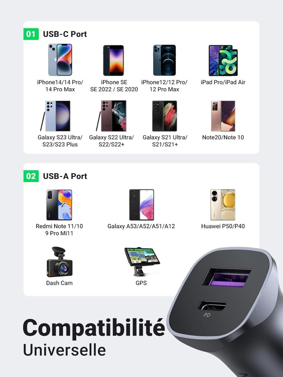 Notre chargeur USB pour véhicule est conçu pour fonctionner avec une large gamme d’appareils tels que les iPhone, les Galaxy, les Pixel et bien d’autres modèles. Sa prise en charge des tensions de 12V à 24V lui permet de s’adapter à la majorité des véhicules. Vous profitez ainsi d’une solution de recharge unique, capable d’accompagner aussi bien vos trajets quotidiens que vos voyages longue distance.