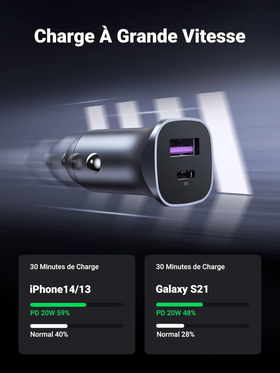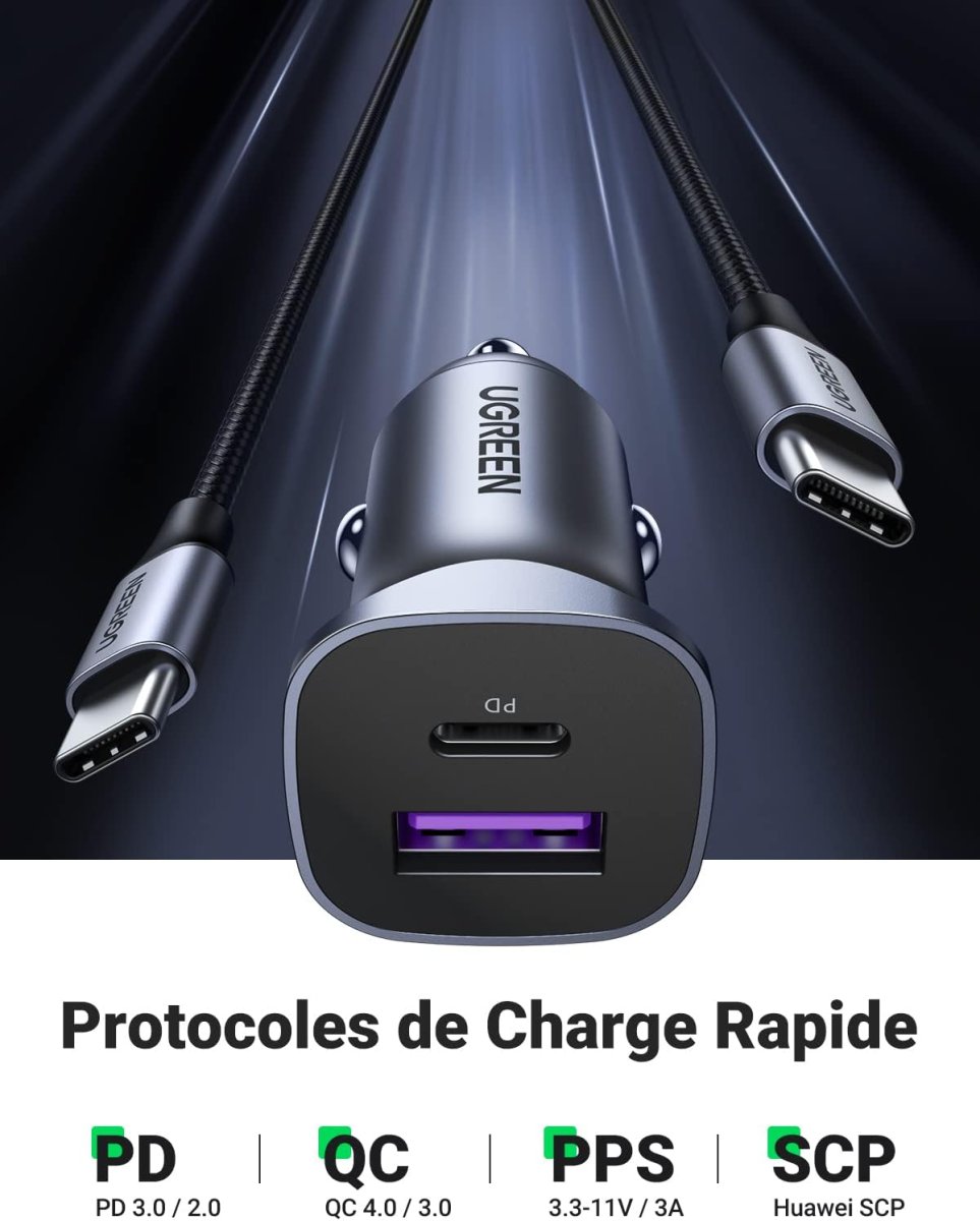 Chargeur Rapide Smartphone Voiture USB-C Double Port 30W