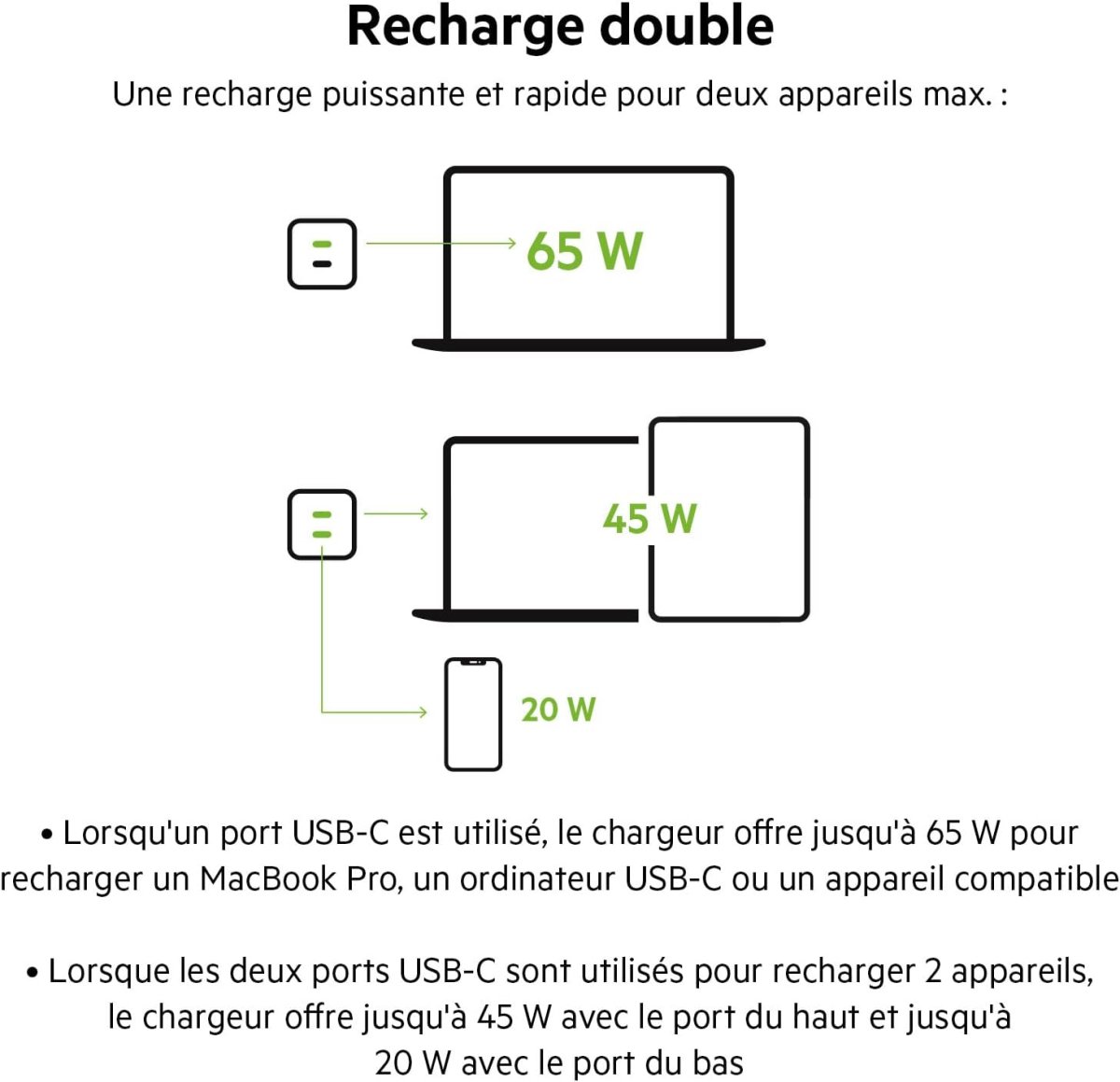 | Puissance de 65 W sur un seul port ou 45 W + 20 W en double | |