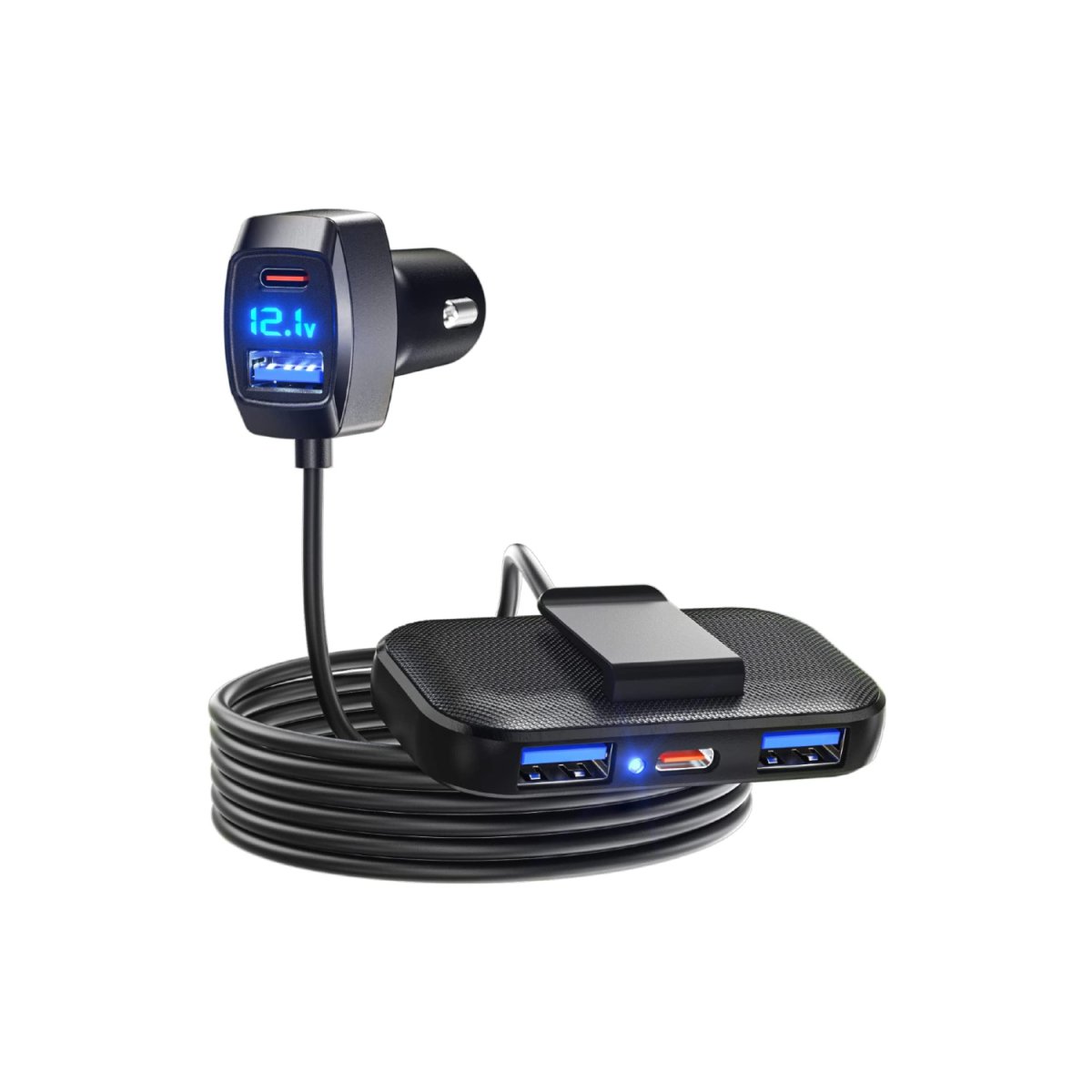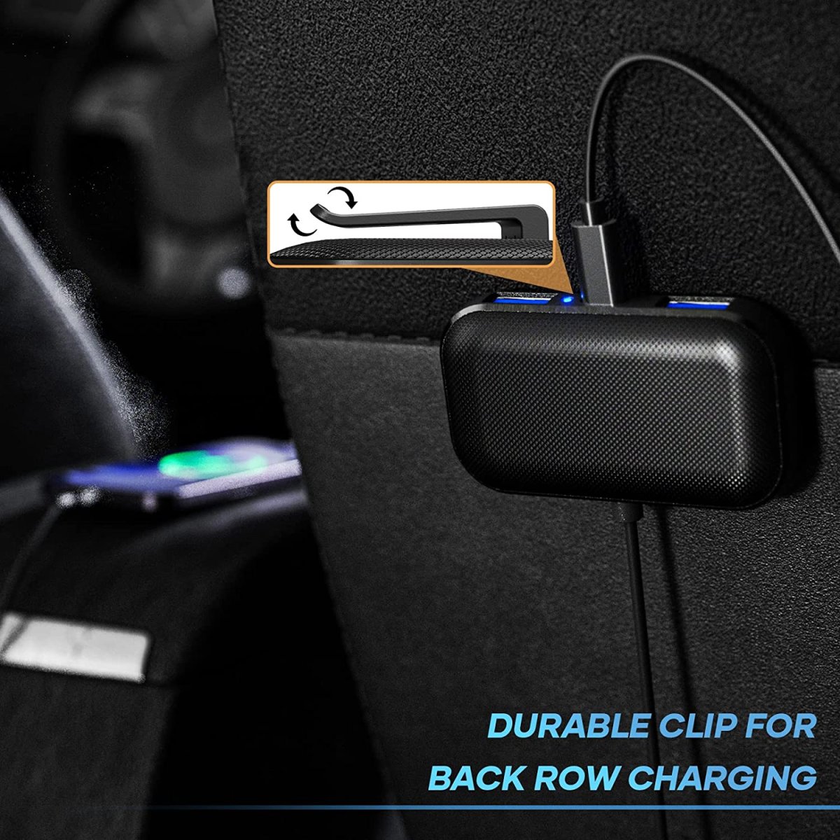 Notre Chargeur pour voiture dispose au total de 5 ports USB (3 USB-A et 2 USB-C), son support externe est équipé d’une pince clipsable à l’arrière afin de faciliter la charge aux passagers du trajet ❤️.