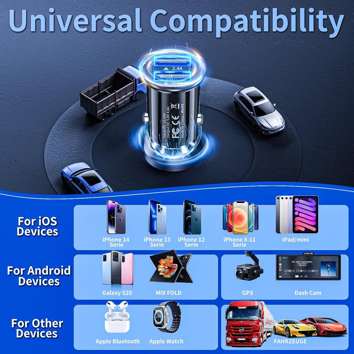 Notre adaptateur allume-cigare USB est compatible avec une large gamme d’appareils : iPhone 15/14/13/12, Samsung Galaxy S23/S22/S21, Google Pixel, Huawei, Xiaomi, tablettes, écouteurs Bluetooth, montres connectées, GPS et bien plus encore. Sa polyvalence garantit une efficacité maximale pour tous vos équipements électroniques.