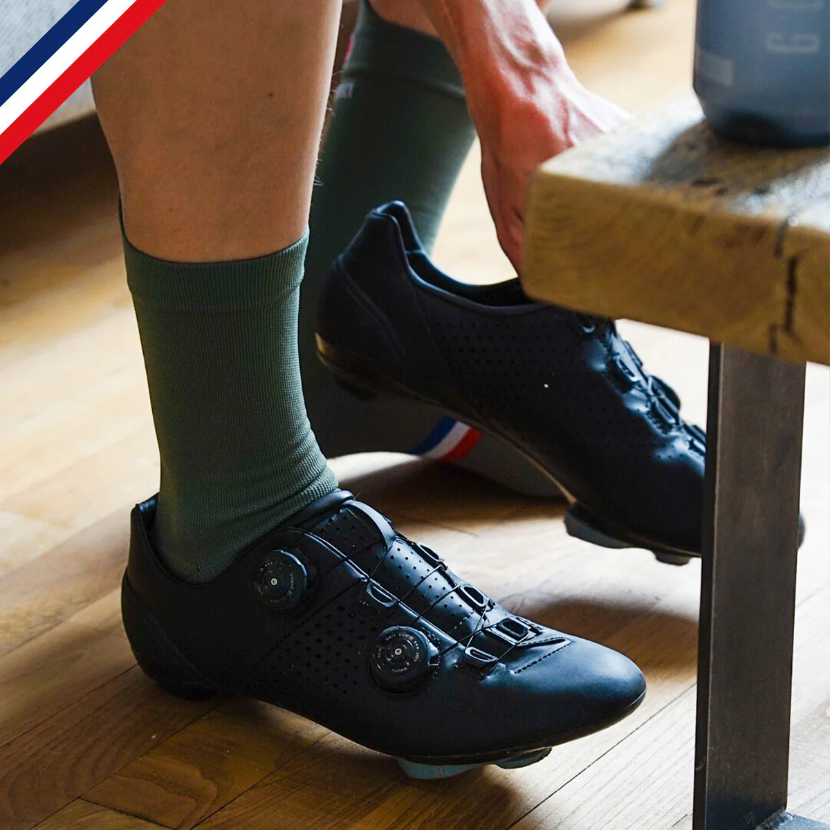 Notre de paire de chaussettes de cyclisme fabriquée à partir de polyamide recyclé, allie technicité et engagement environnemental.