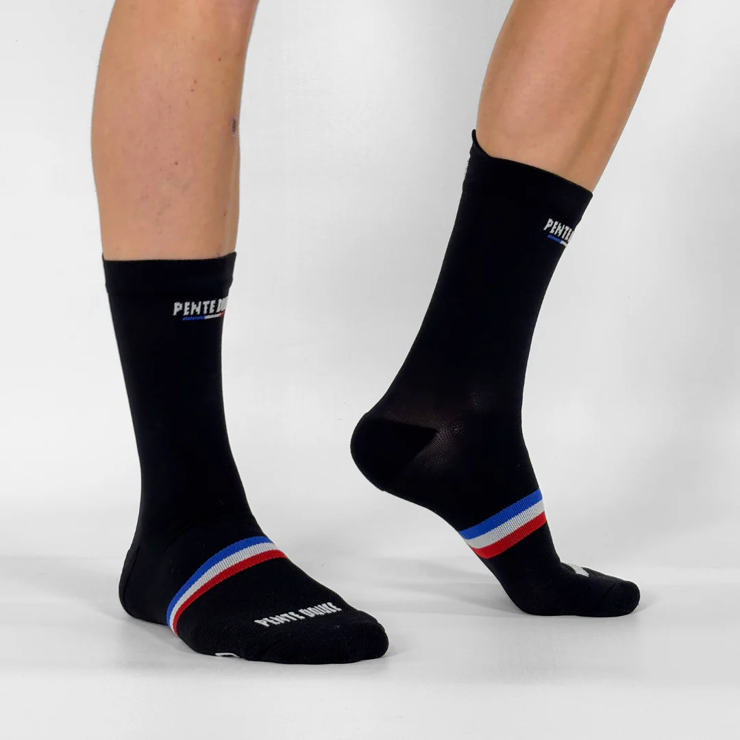 Notre de paire de chaussettes de cyclisme fabriquée à partir de polyamide recyclé, allie technicité et engagement environnemental.
