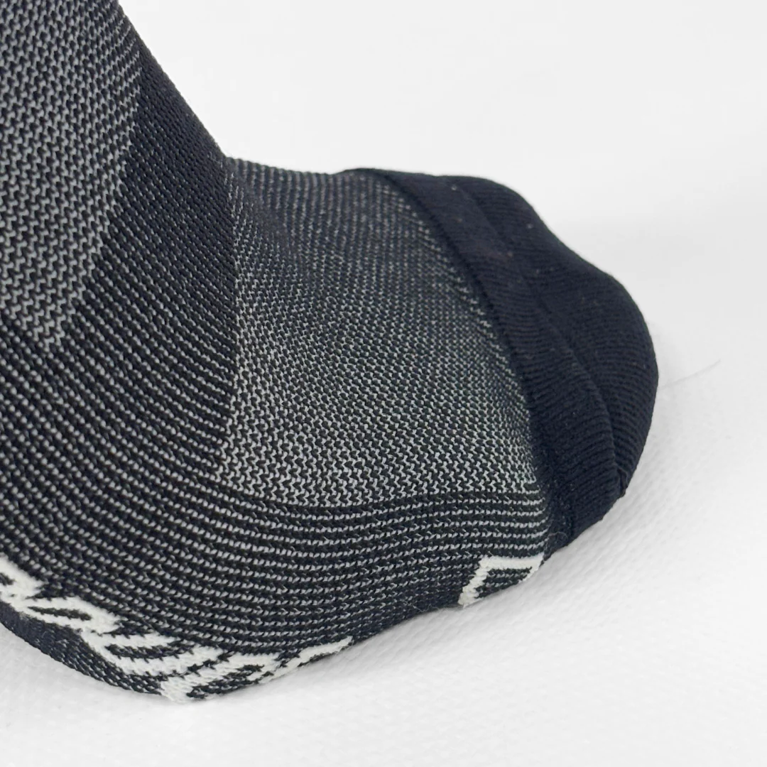 Notre de paire de chaussettes de cyclisme fabriquée à partir de polyamide recyclé, allie technicité et engagement environnemental.
