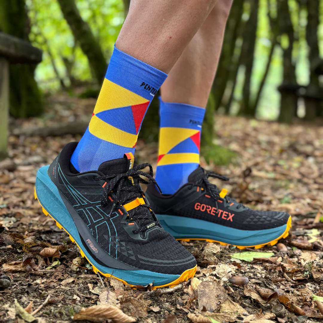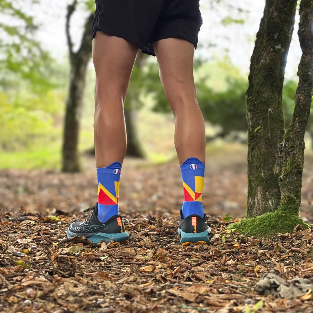 Les chaussettes de trail La Grande Raideuse s’inspirent du mythique Grand Raid de La Réunion : résistantes, respirantes et fabriquées en France à partir de fibres recyclées .