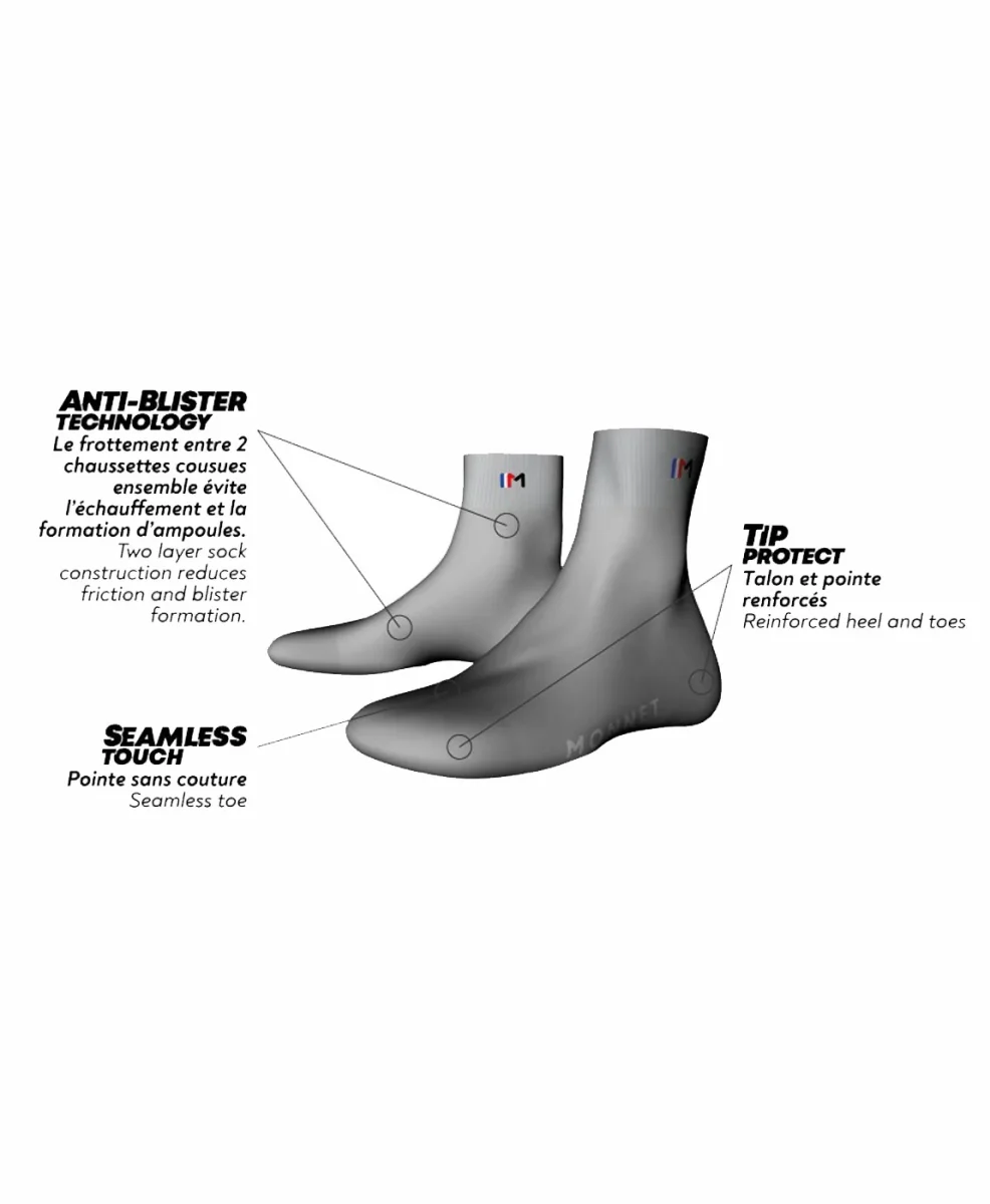 Certains l’appellent « chaussette double » car il s’agit de deux chaussettes en une, reliées entre elles ! Le frottement se fait entre les deux paires de chaussettes, et non pas sur le pied, le protégeant ainsi de l’apparition des ampoules.