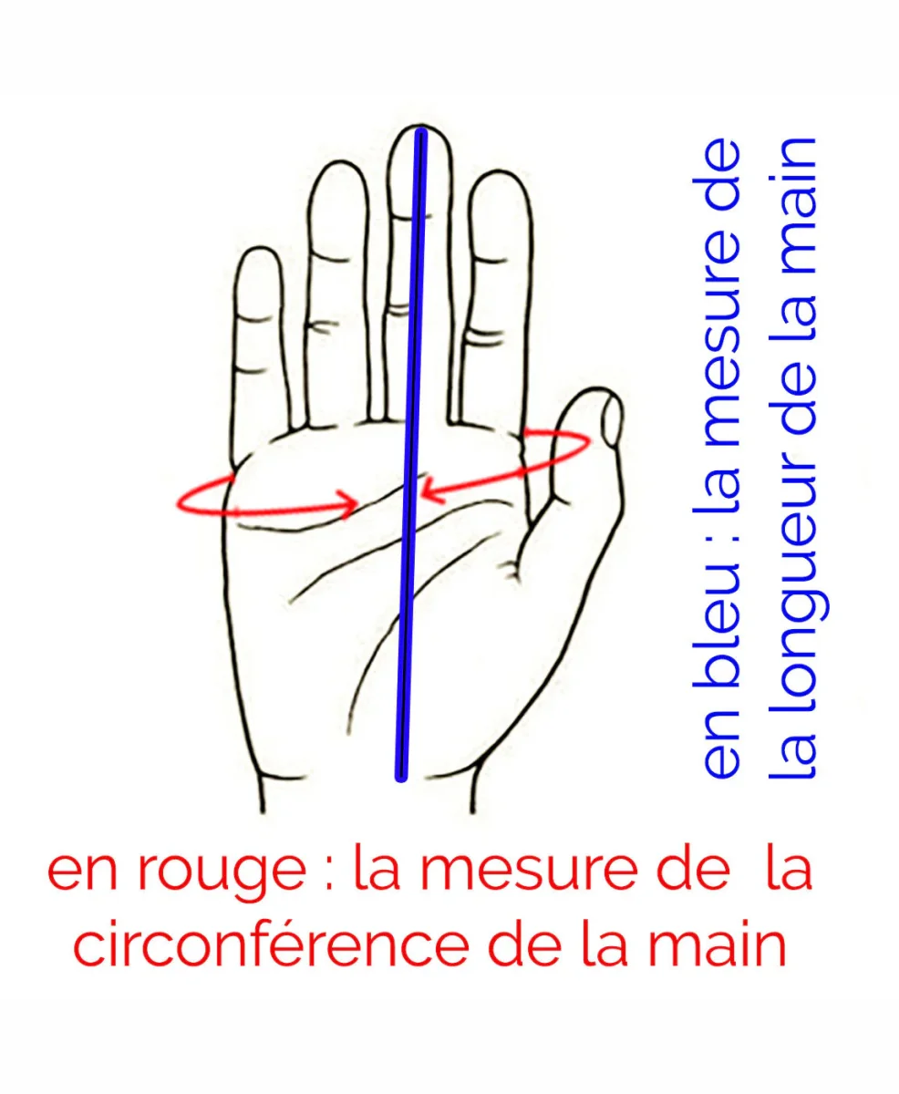 Mesurez également votre tour de main, (faites le tour de votre main, en haut de votre paume, juste sous la base de vos doigts).