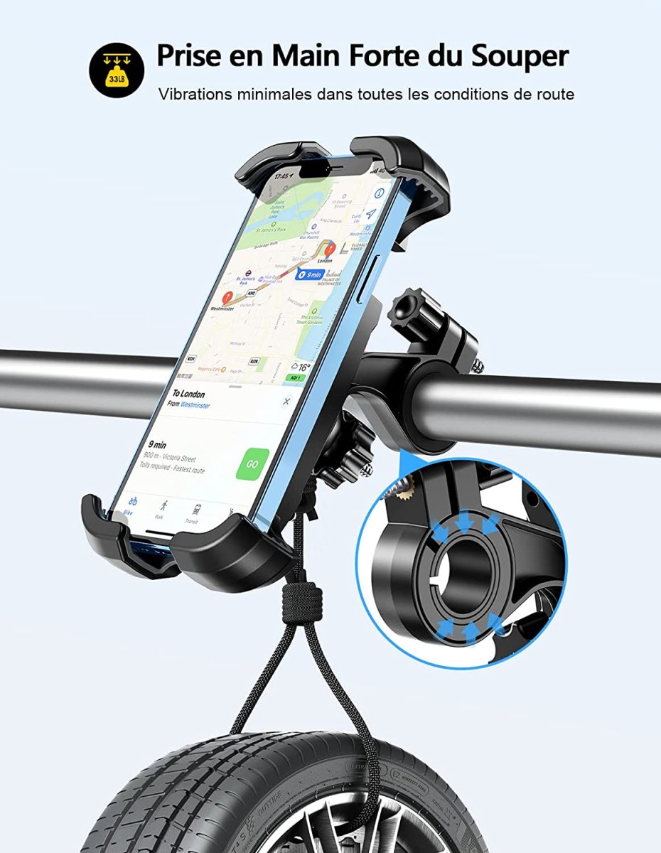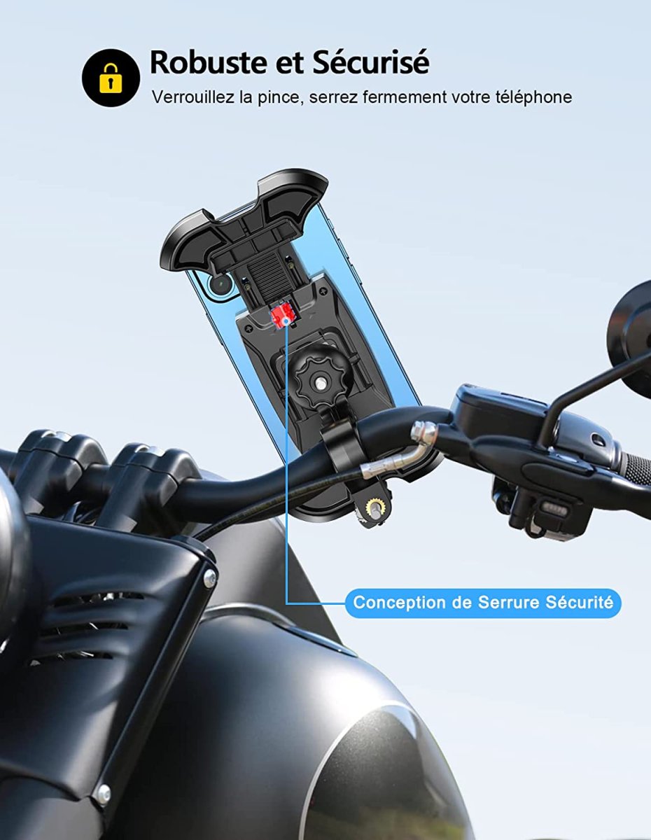 Notre Porte Téléphone pour motos, VTT, vélos et autres véhicules à deux roues se fixe sur les guidons et est compatible avec tous les téléphones d’une taille de 4,7 pouces minimum et de 6,8 pouces maximum.