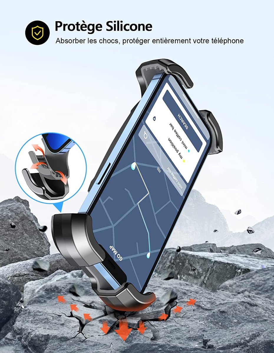 Il protège le téléphone de potentielles rayures et minimise les vibrations rencontrées sur des trajets cahoteux. Ses 4 coussinets en silicone absorbent les chocs et évitent au smartphone de déraper.