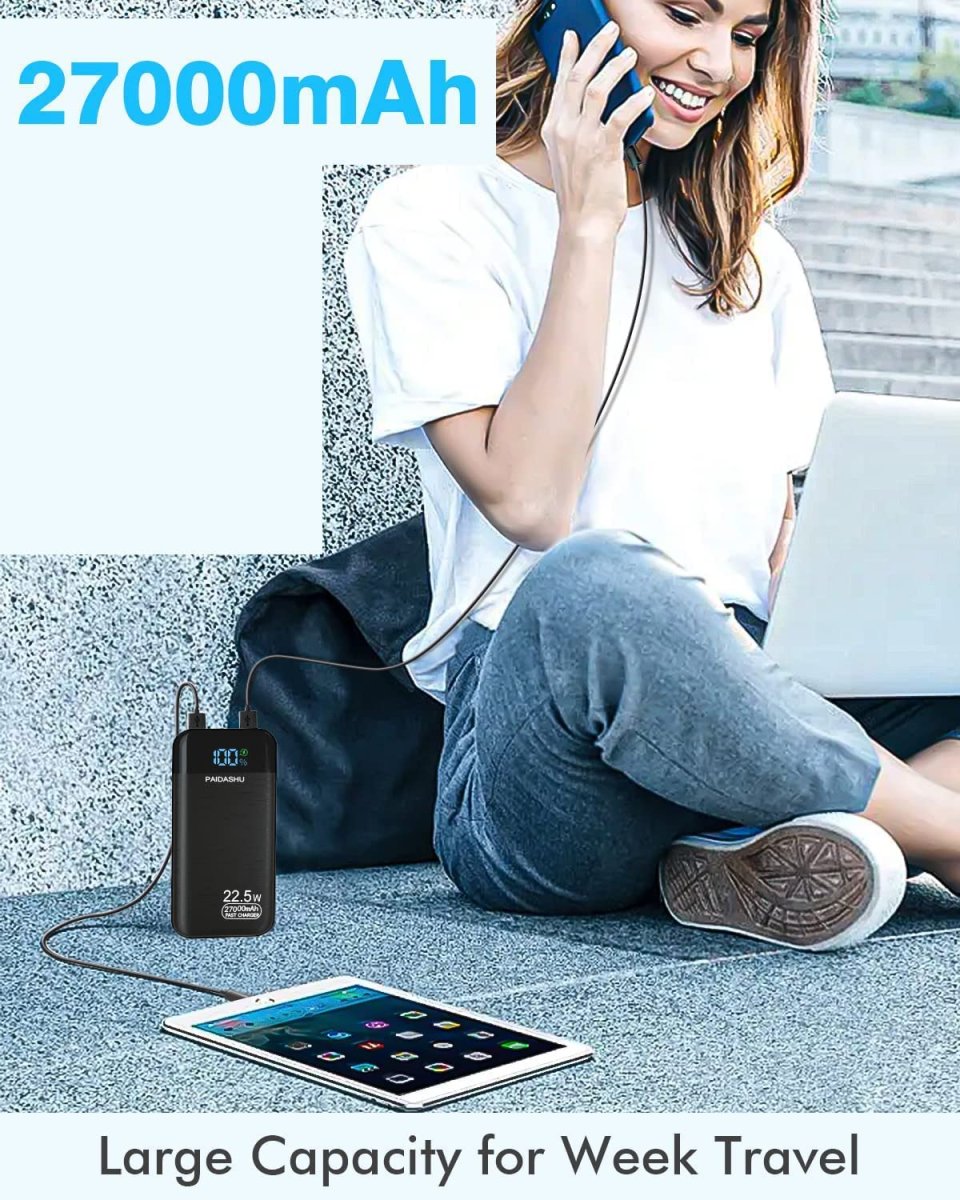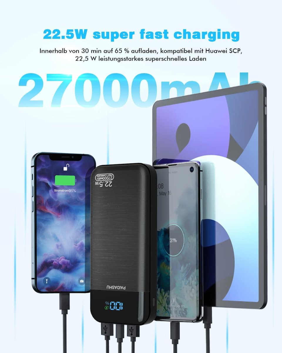 La capacité imposante de notre Power Bank 27 000 mAh vous permettra de recharger votre téléphone de nombreuses fois. Par exemple, il peut charger un iPhone 13 Pro plus de 5 fois, un Samsung Galaxy S22 Ultra 4 fois, et un OnePlus 10 Pro 2,7 fois. Cette capacité généreuse répondra parfaitement à vos besoins, que ce soit lors de courts voyages, de voyages d’affaires, de camping, d’alpinisme ou encore pour faire face à des situations d’urgence 😊.