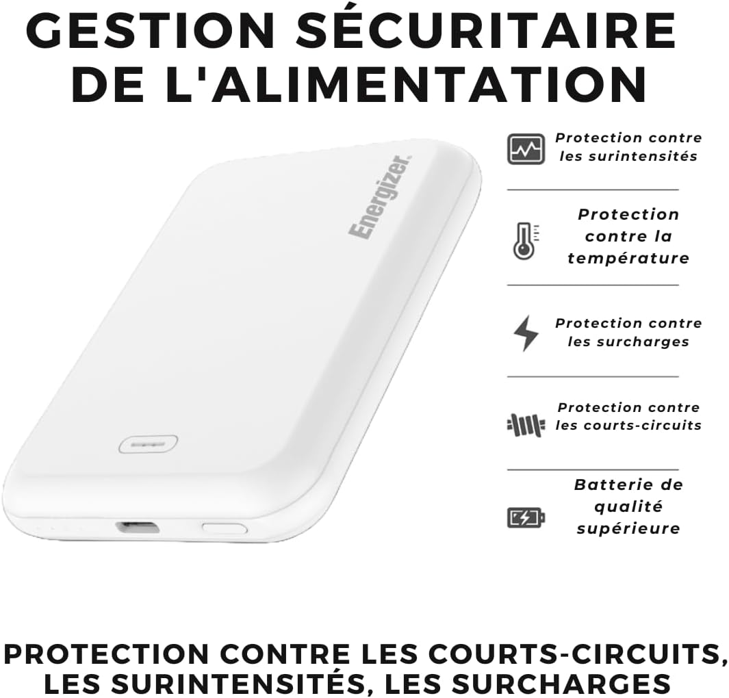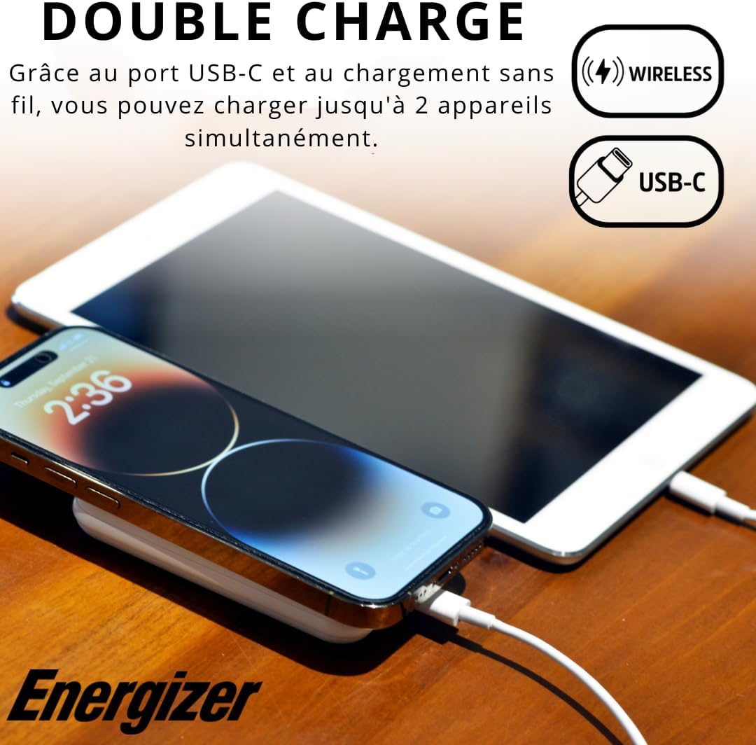 Notre module énergétique portatif combine un port USB-C de 15 W et une surface magnétique de même puissance pour recharger deux appareils simultanément. Vous pouvez ainsi alimenter un smartphone et un accessoire en même temps. Notre système offre une flexibilité accrue, une sécurité optimale, une adaptabilité avec plusieurs appareils, une autonomie prolongée et une convenance totale pour vos besoins variés.