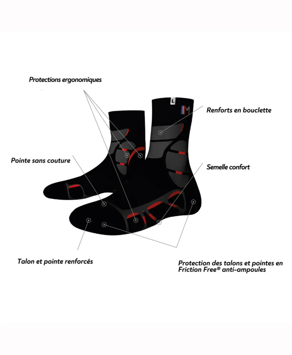Système anti-friction : prévient l’apparition d’ampoules, de zones irritées ou de durillons (protection des talons et pointes en fibre Friction Free… un polyamide à faible taux de frottement et donc anti-ampoules) ;