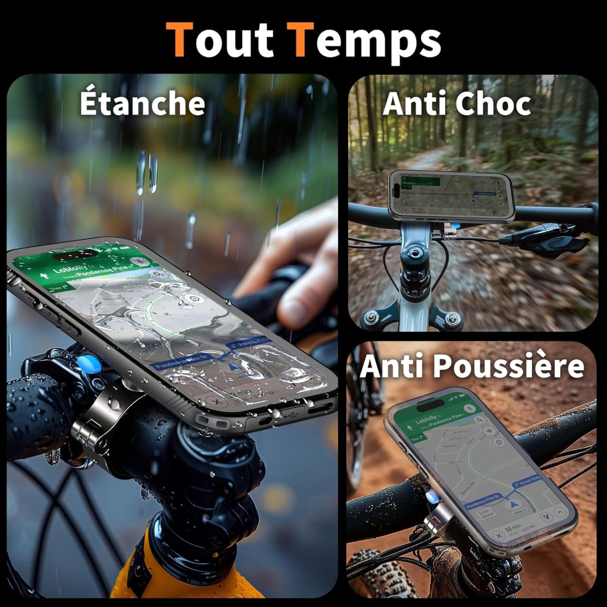Notre support guidon iPhone 16 Pro est conçu pour résister aux éléments : pluie, poussière, boue et sueur n’affectent pas sa performance. L’utilisation de métal, alliage de zinc, et caoutchouc antidérapant garantit une protection optimale de votre téléphone contre les impacts et vibrations. Le design assure stabilité, robustesse et longévité, même dans les environnements les plus exigeants.