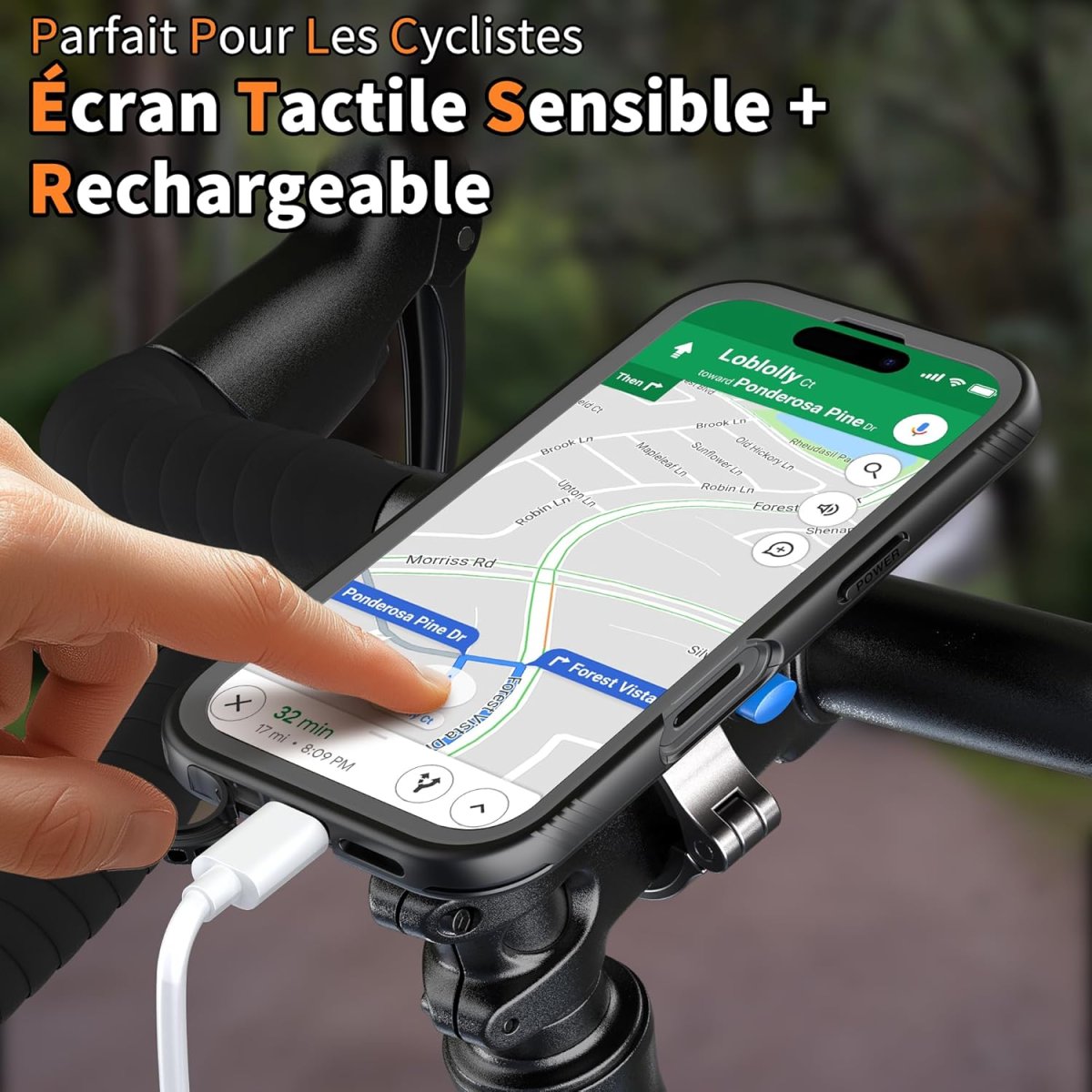 La coque étanche fournie avec notre support iPhone 16 Pro Moto protège intégralement votre téléphone, y compris l’écran, l’appareil photo et les bords, contre les chutes, pluie, et autres agressions extérieures. Elle permet de manipuler le téléphone normalement pour accéder au GPS, appels ou musique sans compromettre la sécurité. La combinaison support et coque assure sécurité, fonctionnalité et sérénité lors de chaque déplacement.